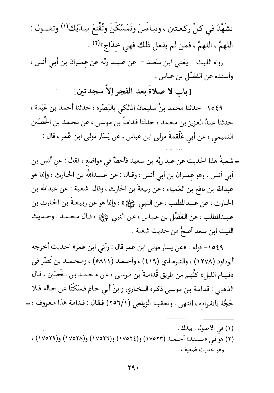 1549 - حَدَّثَنَا مُحَمَّدُ بْنُ سُلَيْمَانَ الْمَالِكِيُّ , ثنا أَحْمَدُ بْنُ عَبْدَةَ , ثنا عَبْدُ الْعَزِيزِ بْنُ مُحَمَّدٍ , أنا قُدَامَةُ بْنُ مُوسَى , عَنْ مُحَمَّدِ بْنِ الْحُصَيْنِ التَّمِيمِيِّ , عَنْ أَبِي عَلْقَمَةَ مَوْلَى ابْنِ عَبَّاسٍ , عَنْ يَسَارٍ مَوْلَى ابْنِ عُمَرَ , قَالَ: -[291]- رَآنِي ابْنُ عُمَرَ أُصَلِّي بَعْدَ الْفَجْرِ فَحَصَبَنِي , وَقَالَ: يَا يَسَارُ كَمْ صَلَّيْتَ؟ , قُلْتُ: لَا أَدْرِي , قَالَ: لَا دَرَيْتَ إِنَّ رَسُولَ اللَّهِ صَلَّى اللهُ عَلَيْهِ وَسَلَّمَ خَرَجَ عَلَيْنَا وَنَحْنُ نُصَلِّي هَذِهِ الصَّلَاةَ فَتَغَيَّظَ عَلَيْنَا تَغَيُّظًا شَدِيدًا , ثُمَّ قَالَ: «لِيُبَلِّغْ شَاهِدُكُمْ غَائِبَكُمْ أَنْ §لَا صَلَاةَ بَعْدَ الْفَجْرِ إِلَّا سَجْدَتَيْنِ»
