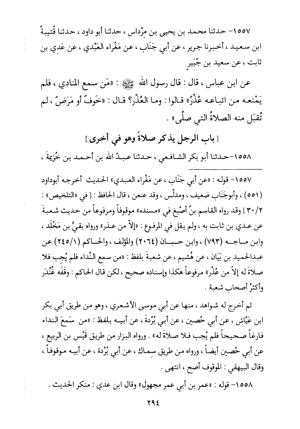 1557 - حَدَّثَنَا مُحَمَّدُ بْنُ يَحْيَى بْنِ مِرْدَاسٍ , ثنا أَبُو دَاوُدَ , ثنا قُتَيْبَةُ بْنُ سَعِيدٍ , ثنا جَرِيرٌ , عَنْ أَبِي جَنَابٍ , عَنْ مَغْرَاءَ الْعَبْدِيِّ , عَنْ عَدِيِّ بْنِ ثَابِتٍ , عَنْ سَعِيدِ بْنِ جُبَيْرٍ , عَنِ ابْنِ عَبَّاسٍ , قَالَ: قَالَ رَسُولُ اللَّهِ صَلَّى اللهُ عَلَيْهِ وَسَلَّمَ: § «مَنْ سَمِعَ الْمُنَادِيَ فَلَمْ يَمْنَعْهُ مِنِ اتِّبَاعِهِ عُذْرٌ» , قَالُوا: وَمَا الْعُذْرُ؟ , قَالَ: «خَوْفٌ أَوْ مَرَضٌ لَمْ يَقْبَلِ اللَّهُ مِنْهُ الصَّلَاةَ الَّتِي صَلَّى»