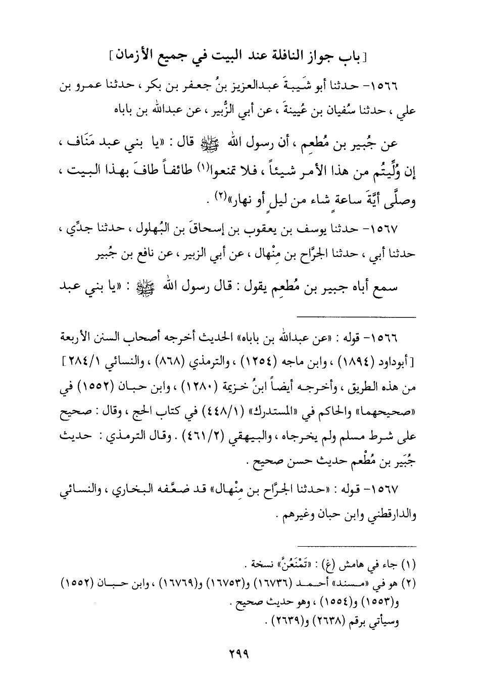 1566 - حَدَّثَنَا أَبُو شَيْبَةَ عَبْدُ الْعَزِيزِ بْنُ جَعْفَرِ بْنِ بُكَيْرٍ , ثنا عَمْرُو بْنُ عَلِيٍّ , ثنا سُفْيَانُ بْنُ عُيَيْنَةَ , عَنْ أَبِي الزُّبَيْرِ , عَنْ عَبْدِ اللَّهِ بْنِ بَابَاهُ , عَنْ جُبَيْرِ بْنِ مُطْعِمٍ , أَنَّ رَسُولَ اللَّهِ صَلَّى اللهُ عَلَيْهِ وَسَلَّمَ قَالَ: «يَا بَنِي عَبْدِ مَنَافٍ إِنْ وُلِّيتُمَّ مِنْ هَذَا الْأَمْرِ شَيْئًا §فَلَا تَمْنَعُنَّ طَائِفًا طَافَ بِهَذَا الْبَيْتِ وَصَلَّى أَيَّةَ سَاعَةٍ شَاءَ مِنْ لَيْلٍ أَوْ نَهَارٍ»