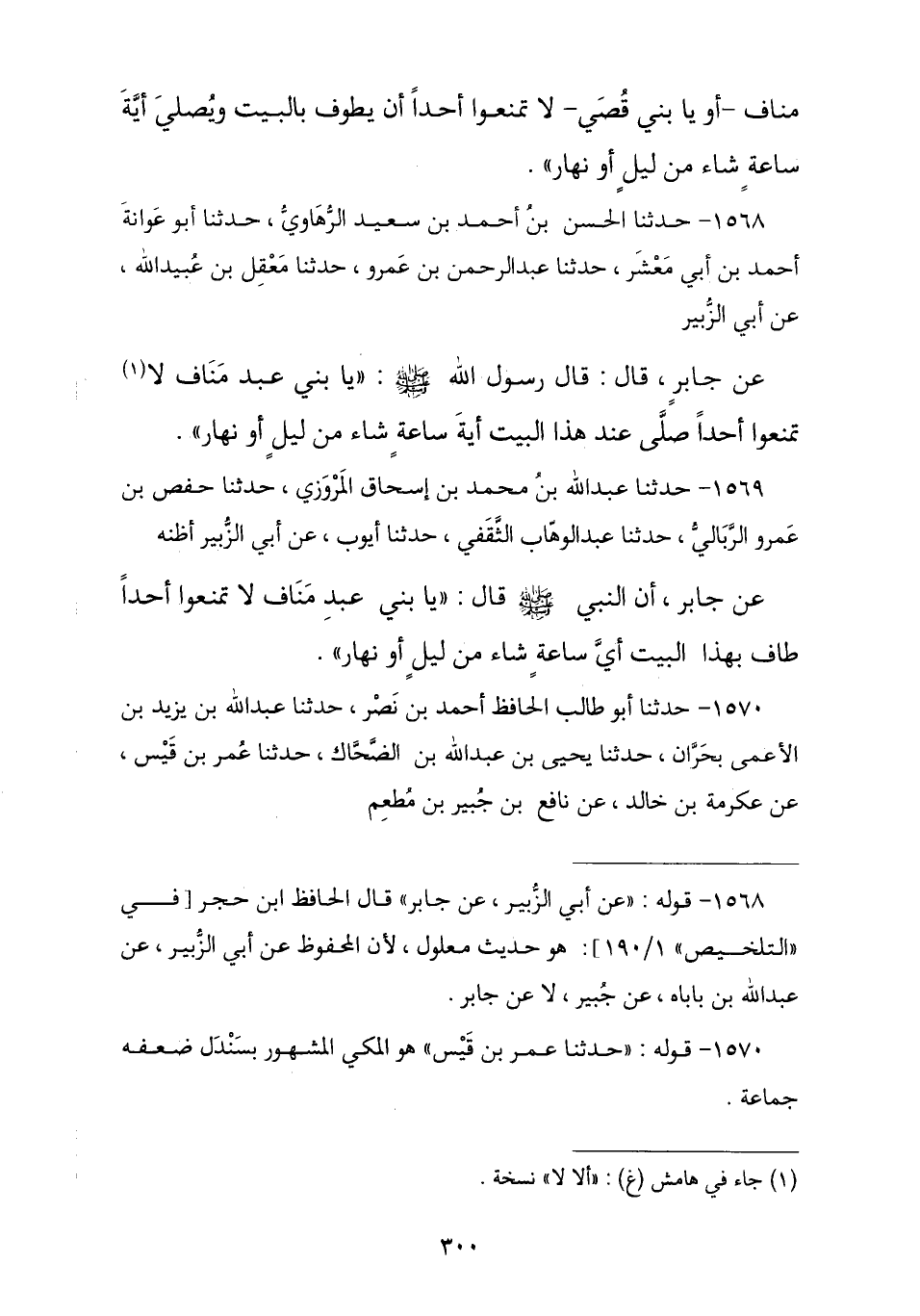 1570 - حَدَّثَنَا أَبُو طَالِبٍ الْحَافِظُ أَحْمَدُ بْنُ نَصْرٍ , ثنا عَبْدُ اللَّهِ بْنُ يَزِيدَ الْأَعْمَى بِحَرَّانَ , ثنا يَحْيَى بْنُ عَبْدِ اللَّهِ بْنِ الضَّحَّاكِ , ثنا عَمْرُو بْنُ قَيْسٍ , عَنْ عِكْرِمَةَ بْنِ خَالِدٍ , عَنْ نَافِعِ بْنِ جُبَيْرِ بْنِ مُطْعِمٍ , -[301]- عَنْ أَبِيهِ , عَنِ النَّبِيِّ صَلَّى اللهُ عَلَيْهِ وَسَلَّمَ قَالَ: «يَا بَنِي عَبْدِ مَنَافٍ §لَا تَمْنَعُوا أَحَدًا يُصَلِّي عِنْدَ هَذَا الْبَيْتِ أَيَّ سَاعَةٍ شَاءَ مِنْ لَيْلٍ أَوْ نَهَارٍ»
