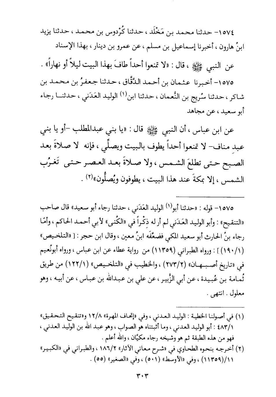 1575 - حَدَّثَنَا عُثْمَانُ بْنُ أَحْمَدَ الدَّقَّاقُ , ثنا جَعْفَرُ بْنُ مُحَمَّدِ بْنِ شَاكِرٍ , ثنا سُرَيْجُ بْنُ النُّعْمَانِ , ثنا أَبُو الْوَلِيدِ الْعَدَنِيُّ , ثنا رَجَاءٌ أَبُو سَعِيدٍ , ثنا مُجَاهِدٌ , عَنِ ابْنِ عَبَّاسٍ , أَنَّ النَّبِيَّ صَلَّى اللهُ عَلَيْهِ وَسَلَّمَ , قَالَ: «يَا بَنِي عَبْدِ الْمُطَّلِبِ , أَوْ يَا بَنِي عَبْدِ مَنَافٍ §لَا تَمْنَعُوا أَحَدًا يَطُوفُ بِالْبَيْتِ وَيُصَلِّي، فَإِنَّهُ لَا صَلَاةَ بَعْدَ الصُّبْحِ حَتَّى تَطْلُعَ الشَّمْسُ , وَلَا صَلَاةَ بَعْدَ الْعَصْرِ حَتَّى تَغْرُبَ الشَّمْسُ , إِلَّا بِمَكَّةَ عِنْدَ هَذَا الْبَيْتِ يَطُوفُونَ وَيُصَلُّونَ»