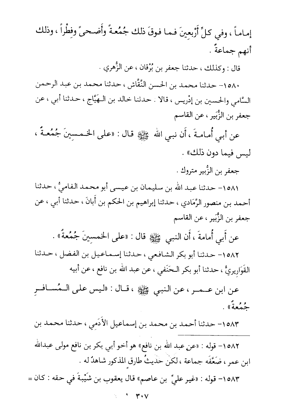 1582 - حَدَّثَنَا أَبُو بَكْرٍ الشَّافِعِيُّ , ثنا إِسْمَاعِيلُ بْنُ الْفَضْلِ , ثنا الْقَوَارِيرِيُّ , ثنا أَبُو بَكْرٍ الْحَنَفِيُّ , عَنْ عَبْدِ اللَّهِ بْنِ نَافِعٍ , عَنْ أَبِيهِ , عَنِ ابْنِ عُمَرَ , عَنِ النَّبِيِّ صَلَّى اللهُ عَلَيْهِ وَسَلَّمَ قَالَ: § «لَيْسَ عَلَى الْمُسَافِرِ جُمُعَةٌ»