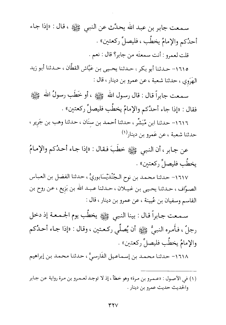1616 - حَدَّثَنَا ابْنُ مُبَشِّرٍ , ثنا أَحْمَدُ بْنُ سِنَانٍ , ثنا وَهْبُ بْنُ جَرِيرٍ , ثنا شُعْبَةُ , عَنْ عَمْرٍو , عَنْ جَابِرٍ , أَنَّ النَّبِيَّ صَلَّى اللهُ عَلَيْهِ وَسَلَّمَ خَطَبَ فَقَالَ: § «إِذَا جَاءَ أَحَدُكُمْ وَالْإِمَامُ يَخْطُبُ فَلْيُصَلِّ رَكْعَتَيْنِ»