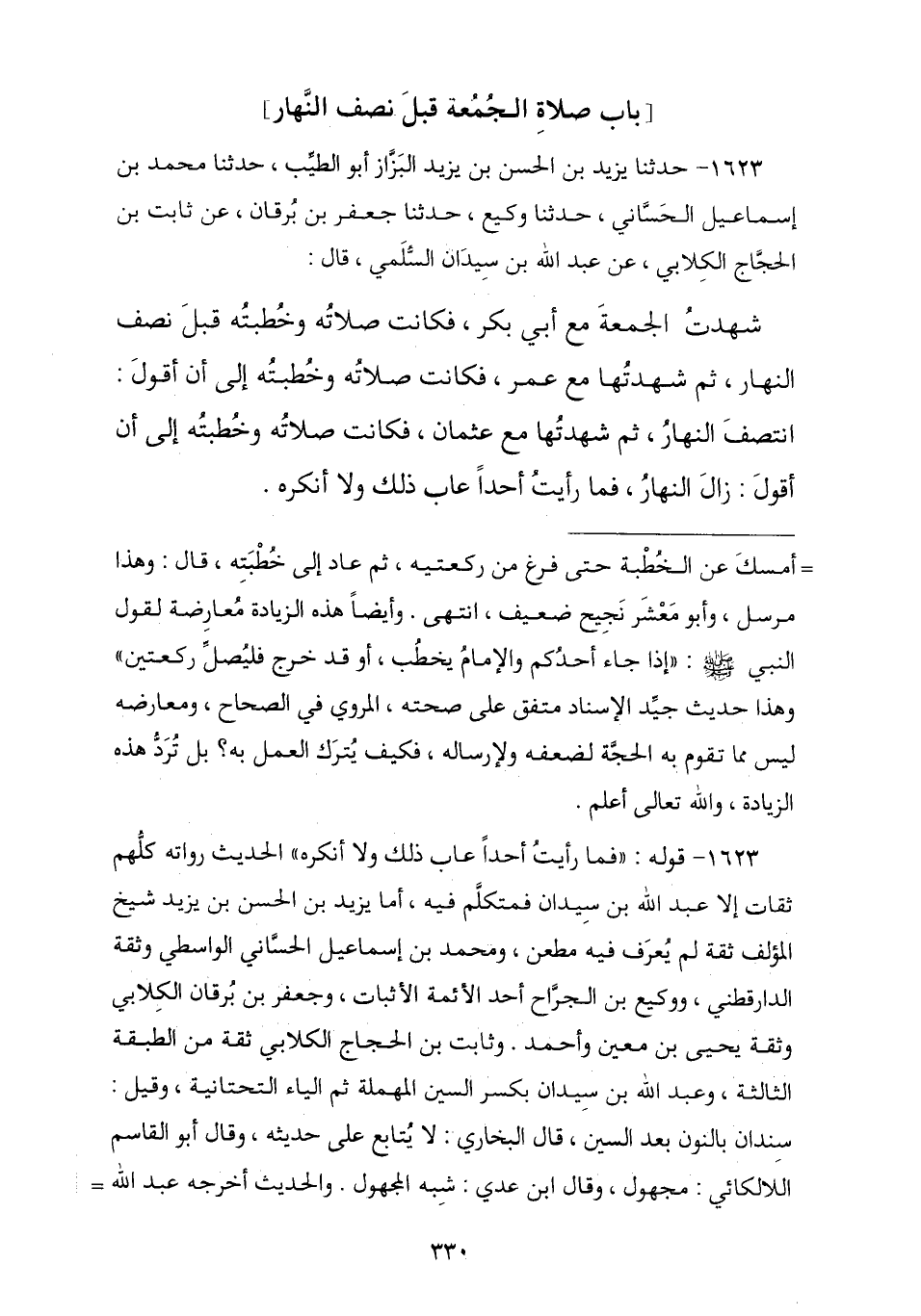 1623 - حَدَّثَنَا يَزِيدُ بْنُ الْحَسَنِ بْنِ يَزِيدَ الْبَزَّازُ أَبُو الطَّيِّبِ , ثنا مُحَمَّدُ بْنُ إِسْمَاعِيلَ الْحَسَّانِيُّ , ثنا وَكِيعٌ , ثنا جَعْفَرُ بْنُ بُرْقَانَ , عَنْ ثَابِتِ بْنِ الْحَجَّاجِ الْكِلَابِيِّ , عَنْ عَبْدِ اللَّهِ بْنِ سِيدَانَ السُّلَمِيِّ , قَالَ: " شَهِدْتُ يَوْمَ الْجُمُعَةِ مَعَ أَبِي بَكْرٍ وَكَانَتْ §صَلَاتُهُ وَخُطْبَتُهُ قَبْلَ نِصْفِ النَّهَارِ , ثُمَّ شَهِدْتُهَا مَعَ عُمَرَ وَكَانَتْ صَلَاتُهُ وَخُطْبَتُهُ إِلَى أَنْ أَقُولَ: انْتَصَفَ النَّهَارُ , ثُمَّ شَهِدْتُهَا مَعَ عُثْمَانَ فَكَانَتْ صَلَاتُهُ وَخُطْبَتُهُ إِلَى أَنْ أَقُولَ زَالَ النَّهَارُ فَمَا رَأَيْتُ أَحَدًا عَابَ ذَلِكَ وَلَا أَنْكَرَهُ "