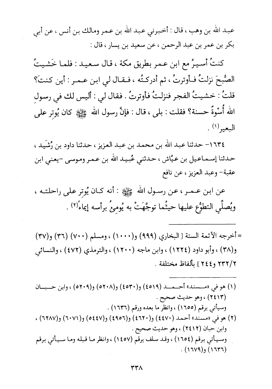 1634 - حَدَّثَنَا عَبْدُ اللَّهِ بْنُ مُحَمَّدِ بْنِ عَبْدِ الْعَزِيزِ , ثنا دَاوُدُ بْنُ رُشَيْدٍ , ثنا إِسْمَاعِيلُ بْنُ عَيَّاشٍ , حَدَّثَنِي عُبَيْدُ اللَّهِ بْنُ عُمَرَ , وَمُوسَى يَعْنِي ابْنَ عُقْبَةَ , وَعَبْدُ الْعَزِيزِ , عَنْ نَافِعٍ , عَنِ ابْنِ عُمَرَ , عَنْ رَسُولِ اللَّهِ صَلَّى اللهُ عَلَيْهِ وَسَلَّمَ «أَنَّهُ كَانَ §يُوتِرُ عَلَى رَاحِلَتِهِ , وَيُصَلِّي التَّطَوُّعَ عَلَيْهَا حَيْثُمَا تَوَجَّهَتْ بِهِ يُومِئُ بِرَأْسِهِ إِيمَاءً»