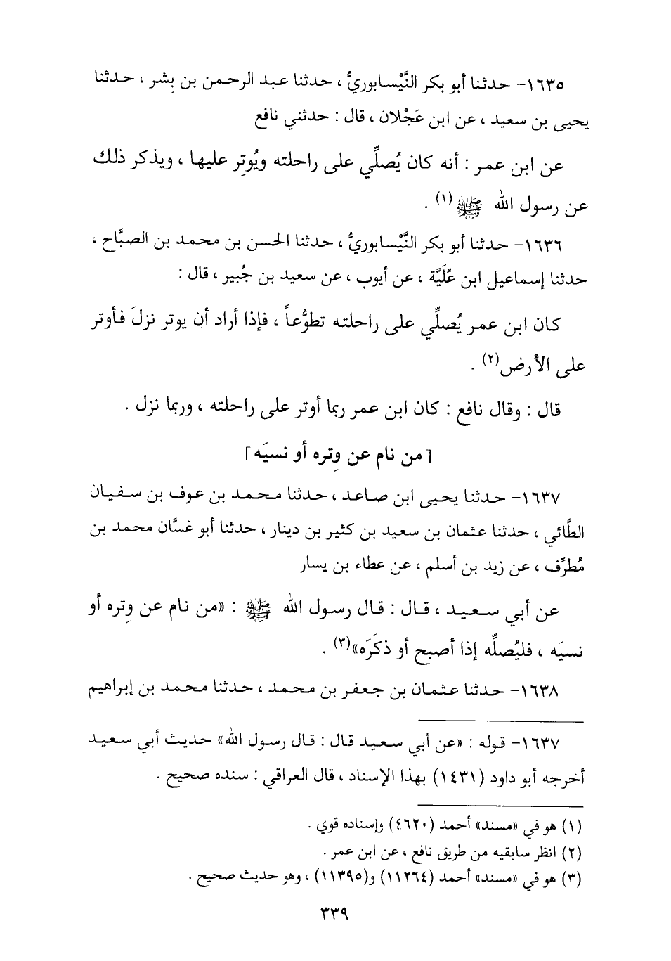 1636 - حَدَّثَنَا أَبُو بَكْرٍ النَّيْسَابُورِيُّ , ثنا الْحَسَنُ بْنُ مُحَمَّدٍ الصَّبَّاحُ , ثنا إِسْمَاعِيلُ ابْنُ عُلَيَّةَ , عَنْ أَيُّوبَ , عَنْ سَعِيدِ بْنِ جُبَيْرٍ , قَالَ: كَانَ ابْنُ عُمَرَ § «يُصَلِّي عَلَى رَاحِلَتِهِ تَطَوُّعًا فَإِذَا أَرَادَ أَنْ يُوتِرَ نَزَلَ فَأَوْتَرَ عَلَى الْأَرْضِ» , قَالَ: وَقَالَ نَافِعٌ: كَانَ ابْنُ عُمَرَ «رُبَّمَا أَوْتَرَ عَلَى رَاحِلَتِهِ وَرُبَّمَا نَزَلَ»