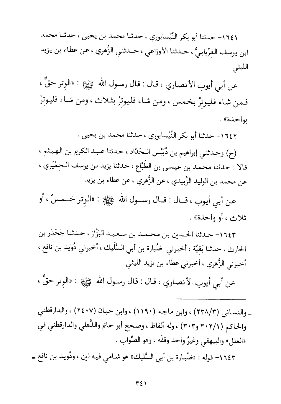 1642 - حَدَّثَنَا أَبُو بَكْرٍ النَّيْسَابُورِيُّ , نا مُحَمَّدُ بْنُ يَحْيَى , وَحَدَّثَنِي إِبْرَاهِيمُ بْنُ دُبَيْسٍ الْحَدَّادُ , ثنا عَبْدُ الْكَرِيمِ بْنُ الْهَيْثَمِ , قَالَا: نا مُحَمَّدُ بْنُ عِيسَى بْنِ الطَّبَّاعِ , ثنا يَزِيدُ بْنُ يُوسُفَ الْحِمْيَرِيُّ , عَنْ مُحَمَّدِ بْنِ الْوَلِيدِ الزُّبَيْدِيِّ , عَنِ الزُّهْرِيِّ , عَنْ عَطَاءِ بْنِ يَزِيدَ , عَنْ أَبِي أَيُّوبَ , قَالَ: قَالَ رَسُولُ اللَّهِ صَلَّى اللهُ عَلَيْهِ وَسَلَّمَ: § «الْوِتْرُ خَمْسٌ أَوْ ثَلَاثٌ أَوْ وَاحِدَةٌ»