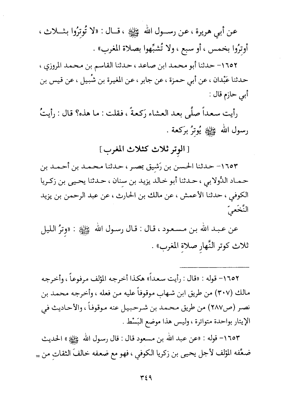 1653 - حَدَّثَنَا الْحَسَنُ بْنُ رُشَيْقٍ بِمِصْرَ , ثنا مُحَمَّدُ بْنُ أَحْمَدَ بْنِ حَمَّادٍ الدُّولَابِيُّ , ثنا أَبُو خَالِدٍ يَزِيدُ بْنُ سِنَانٍ , ثنا يَحْيَى بْنُ زَكَرِيَّا الْكُوفِيُّ , ثنا الْأَعْمَشُ , عَنْ مَالِكِ بْنِ الْحَارِثِ , عَنْ عَبْدِ الرَّحْمَنِ بْنِ يَزِيدَ النَّخَعِيِّ , عَنْ عَبْدِ اللَّهِ بْنِ مَسْعُودٍ , قَالَ: قَالَ رَسُولُ اللَّهِ صَلَّى اللهُ عَلَيْهِ وَسَلَّمَ: § «وِتْرُ اللَّيْلِ ثَلَاثٌ كَوِتْرِ النَّهَارِ صَلَاةُ الْمَغْرِبِ». -[350]- يَحْيَى بْنُ زَكَرِيَّا هَذَا يُقَالُ لَهُ: ابْنُ أَبِي الْحَوَاجِبِ ضَعِيفٌ , وَلَمْ يَرْوِهِ عَنِ الْأَعْمَشِ مَرْفُوعًا غَيْرُهُ