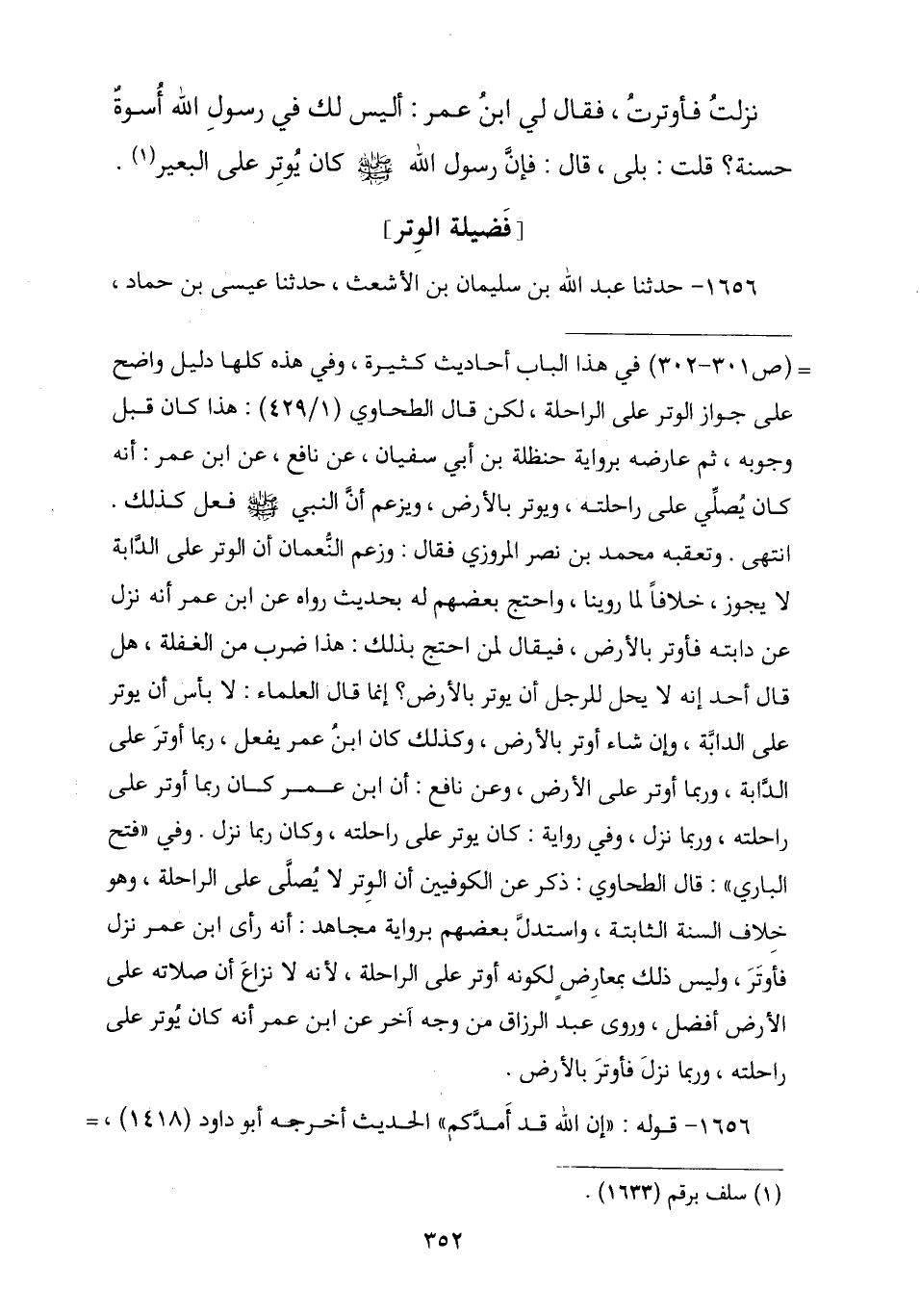 1656 - ثنا عَبْدُ اللَّهِ بْنُ سُلَيْمَانَ بْنِ الْأَشْعَثِ , ثنا عِيسَى بْنُ حَمَّادٍ , -[353]- ثنا اللَّيْثُ بْنُ سَعْدٍ , عَنْ يَزِيدَ بْنِ أَبِي حَبِيبٍ , عَنْ عَبْدِ اللَّهِ بْنِ رَاشِدٍ الزَّوْفِيِّ , عَنْ عَبْدِ اللَّهِ بْنِ أَبِي مُرَّةَ الزَّوْفِيِّ , عَنْ خَارِجَةَ بْنِ حُذَافَةَ , قَالَ: خَرَجَ عَلَيْنَا رَسُولُ اللَّهِ صَلَّى اللهُ عَلَيْهِ وَسَلَّمَ قَالَ: «إِنَّ اللَّهَ قَدْ §أَمَدَّكُمْ بِصَلَاةٍ هِيَ خَيْرٌ لَكُمْ مِنْ حُمُرِ النَّعَمِ , الْوِتْرُ , جَعَلَهُ اللَّهُ لَكُمْ فِيمَا بَيْنَ صَلَاةِ الْعِشَاءِ إِلَى أَنْ يَطْلُعَ الْفَجْرُ»