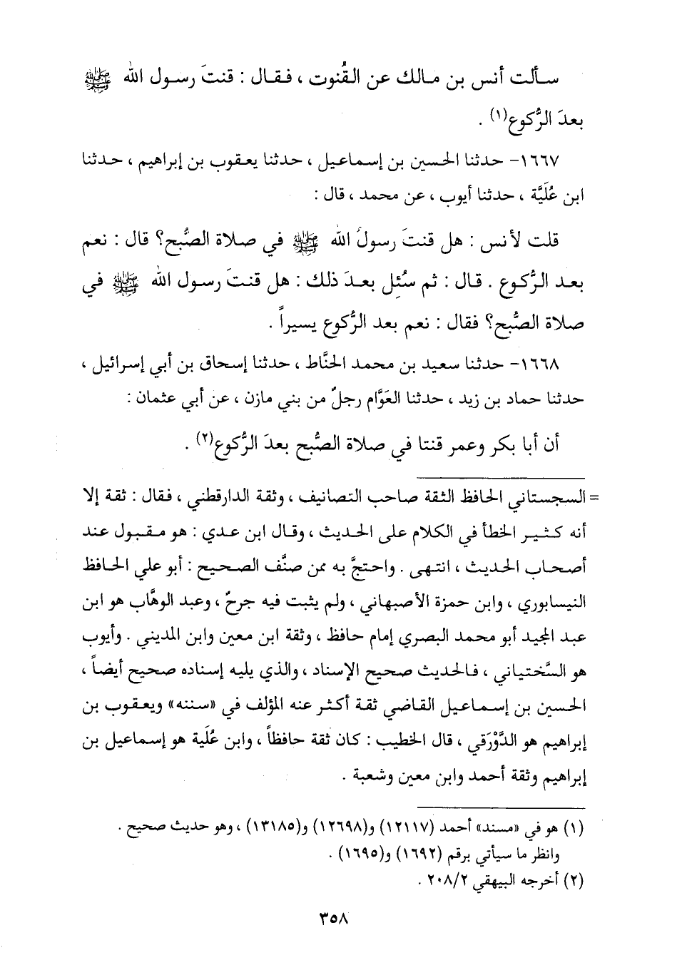 1667 - حَدَّثَنَا الْحُسَيْنُ بْنُ إِسْمَاعِيلَ , ثنا يَعْقُوبُ بْنُ إِبْرَاهِيمَ , ثنا ابْنُ عُلَيَّةَ , ثنا أَيُّوبُ , عَنْ مُحَمَّدٍ , قُلْتُ لِأَنَسٍ: §هَلْ قَنَتَ رَسُولُ اللَّهِ صَلَّى اللهُ عَلَيْهِ وَسَلَّمَ فِي صَلَاةِ الصُّبْحِ؟ , قَالَ: «نَعَمْ بَعْدَ الرُّكُوعِ» , قَالَ: ثُمَّ سُئِلَ بَعْدَ ذَلِكَ: هَلْ قَنَتَ رَسُولُ اللَّهِ صَلَّى اللهُ عَلَيْهِ وَسَلَّمَ فِي صَلَاةِ الصُّبْحِ؟ , قَالَ: «نَعَمْ بَعْدَ الرُّكُوعِ يَسِيرًا»