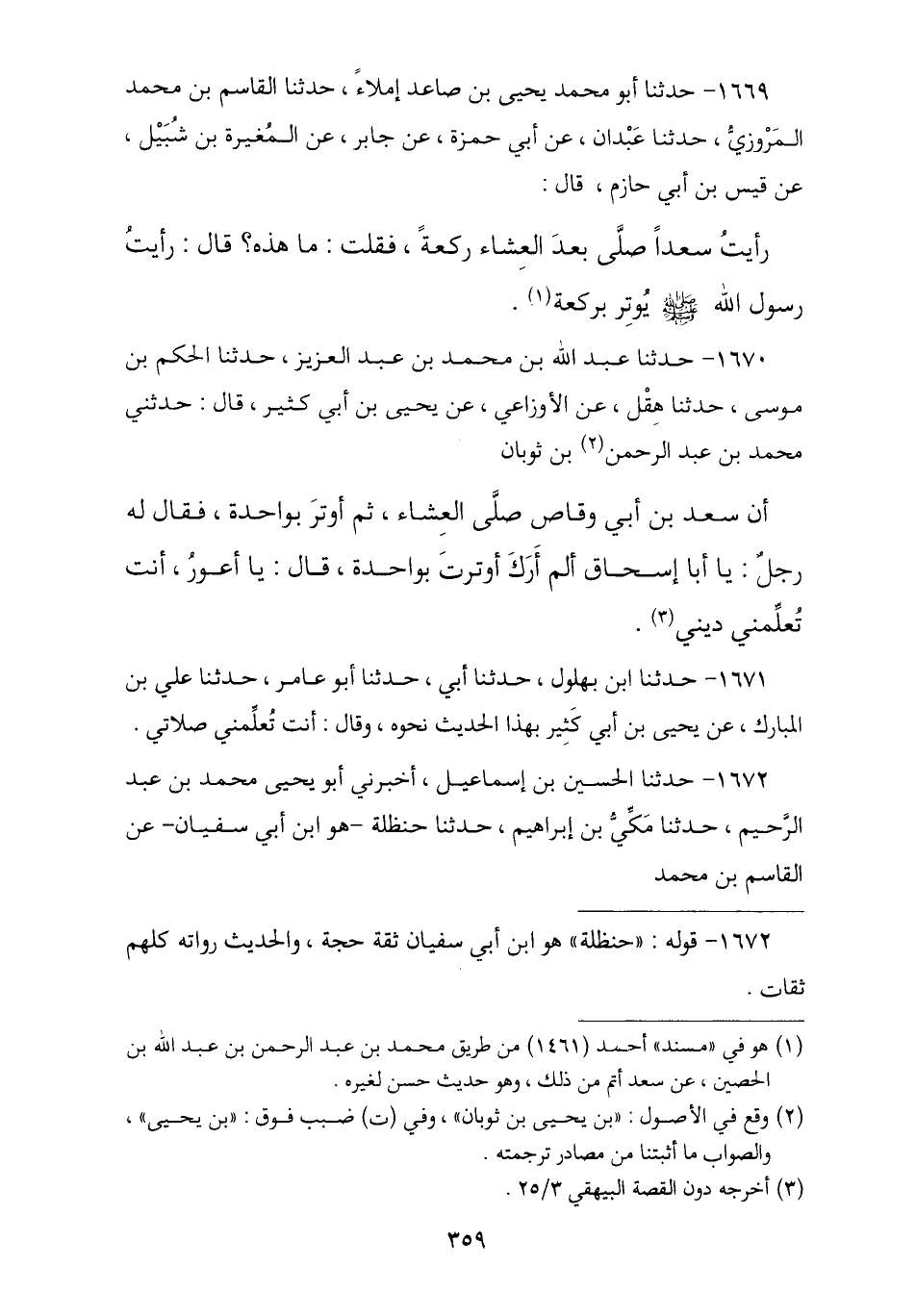 1669 - ثنا أَبُو مُحَمَّدٍ يَحْيَى بْنُ صَاعِدٍ إِمْلَاءً، حَدَّثَنَا الْقَاسِمُ بْنُ مُحَمَّدٍ الْمَرْوَزِيُّ , حَدَّثَنَا عَبْدَانُ عَنْ أَبِي حَمْزَةَ , عَنْ جَابِرٍ , عَنِ الْمُغِيرَةِ بْنِ شُبَيْلٍ , عَنْ قَيْسِ بْنِ أَبِي حَازِمٍ , قَالَ: رَأَيْتُ سَعْدًا صَلَّى بَعْدَ الْعِشَاءِ رَكْعَةً , فَقُلْتُ: مَا هَذِهِ؟ , فَقَالَ: رَأَيْتُ رَسُولَ اللَّهِ صَلَّى اللهُ عَلَيْهِ وَسَلَّمَ § «يُوتِرُ بِرَكْعَةٍ»