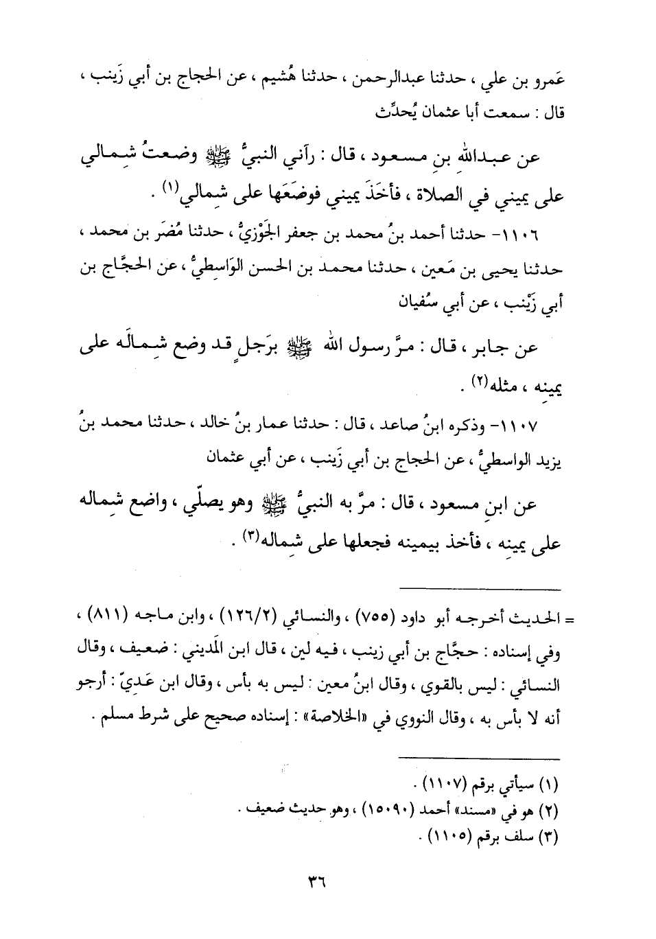 1107 - وَذَكَرَهُ ابْنُ صَاعِدٍ , قَالَ: حَدَّثَنَا عَمَّارُ بْنُ خَالِدٍ , ثنا مُحَمَّدُ بْنُ يَزِيدَ الْوَاسِطِيُّ , عَنِ الْحَجَّاجِ بْنِ أَبِي زَيْنَبَ , عَنْ أَبِي عُثْمَانَ , عَنِ ابْنِ مَسْعُودٍ , قَالَ: «مَرَّ بِهِ النَّبِيُّ صَلَّى اللهُ عَلَيْهِ وَسَلَّمَ §وَهُوَ يُصَلِّي وَاضِعَ شِمَالَهُ عَلَى يَمِينِهِ , فَأَخَذَ بِيَمِينِهِ فَجَعَلَهَا عَلَى شِمَالِهِ»