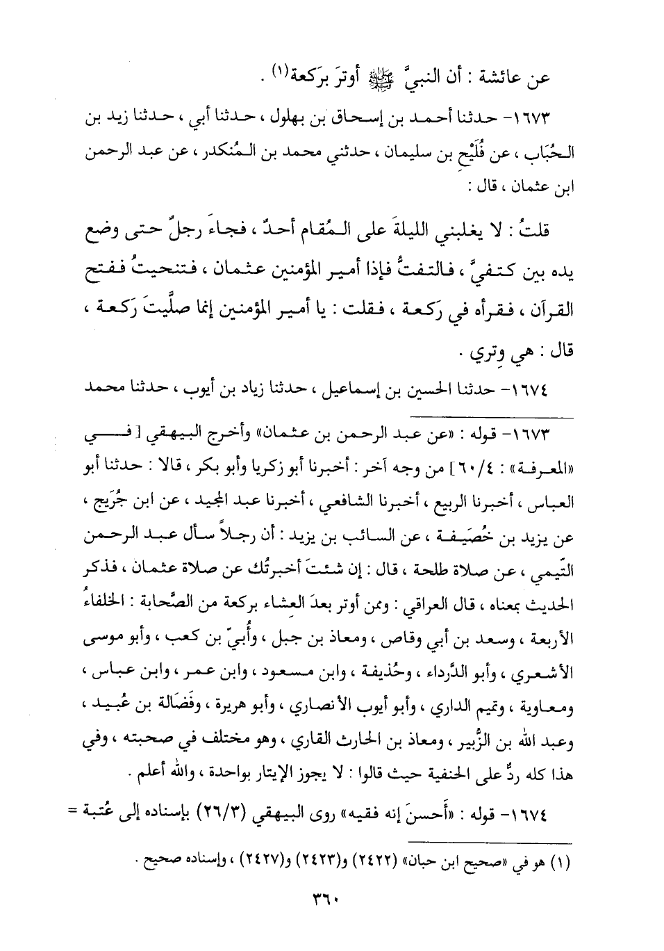 1673 - ثنا أَحْمَدُ بْنُ إِسْحَاقَ بْنِ بُهْلُولٍ , ثنا أَبِي , ثنا زَيْدُ بْنُ الْحُبَابِ , عَنْ فُلَيْحِ بْنِ سُلَيْمَانَ , ثنا مُحَمَّدُ بْنُ الْمُنْكَدِرِ , عَنْ عَبْدِ الرَّحْمَنِ بْنِ عُثْمَانَ , قَالَ: قُلْتُ: لَا يَغْلِبُنِي اللَّيْلَةَ عَلَى الْمَقَامِ أَحَدٌ , فَجَاءَ رَجُلٌ حَتَّى وَضَعَ يَدَهُ بَيْنَ كَتِفَيَّ فَالْتَفَتُّ فَإِذَا أَمِيرُ الْمُؤْمِنِينَ عُثْمَانُ , فَتَنَحَّيْتُ §فَافْتَتَحَ الْقُرْآنَ فَقَرَأَهُ فِي رَكْعَةٍ , فَقُلْتُ: يَا أَمِيرَ الْمُؤْمِنِينَ إِنَّمَا صَلَّيْتَ رَكْعَةً؟ , فَقَالَ: «هِيَ وِتْرِي»