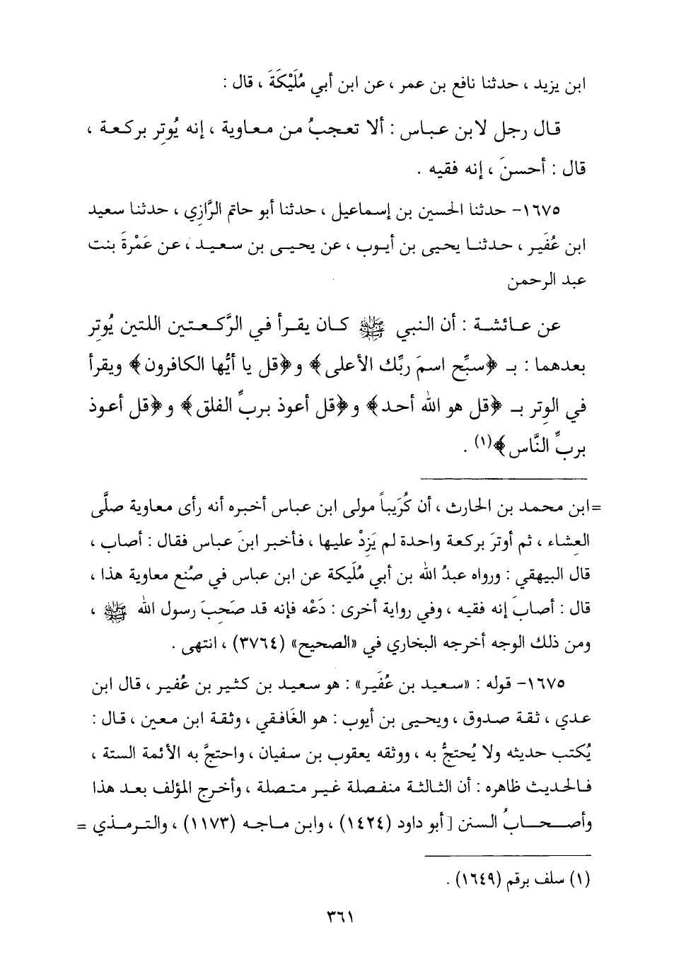 1675 - حَدَّثَنَا الْحُسَيْنُ بْنُ إِسْمَاعِيلَ , ثنا أَبُو حَاتِمٍ الرَّازِيُّ , ثنا سَعِيدُ بْنُ عُفَيْرٍ , ثنا يَحْيَى بْنُ أَيُّوبَ , عَنْ يَحْيَى بْنِ سَعِيدٍ , عَنْ عَمْرَةَ بِنْتِ عَبْدِ الرَّحْمَنِ , عَنْ عَائِشَةَ , «أَنَّ النَّبِيَّ صَلَّى اللهُ عَلَيْهِ وَسَلَّمَ» كَانَ §يَقْرَأُ فِي الرَّكْعَتَيْنِ الَّتِي يُوتِرُ بَعْدَهُمَا بِسَبِّحِ اسْمَ رَبِّكَ الْأَعْلَى , وَقُلْ يَا أَيُّهَا الْكَافِرُونَ , وَيَقْرَأُ فِي الْوِتْرِ بِقُلْ هُوَ اللَّهُ أَحَدٌ , وَقُلْ أَعُوذُ بِرَبِّ الْفَلَقِ , وَقُلْ أَعُوذُ بِرَبِّ النَّاسِ "
