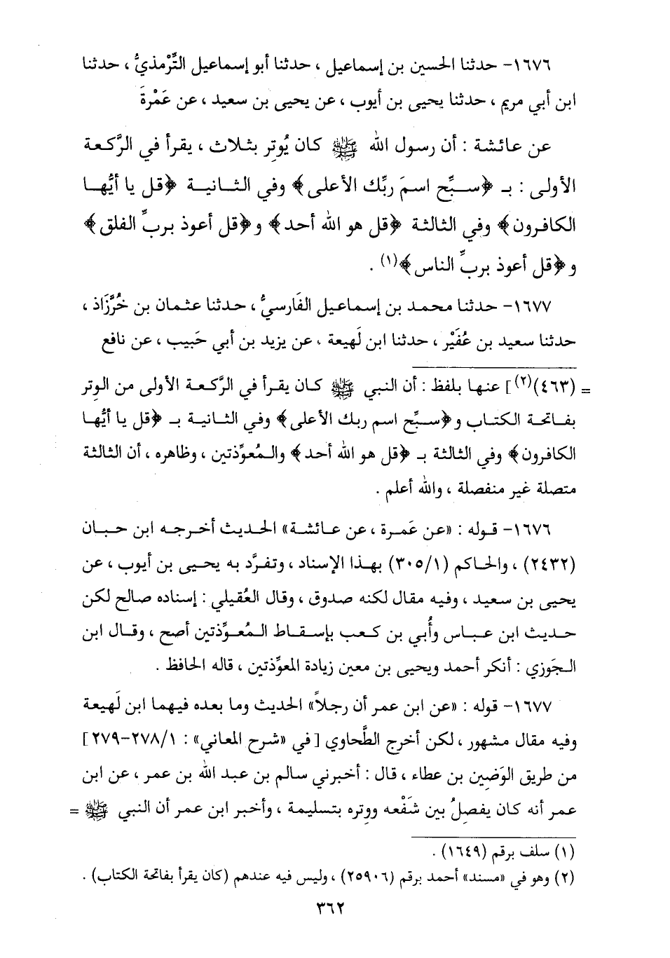 1676 - حَدَّثَنَا الْحُسَيْنُ بْنُ إِسْمَاعِيلَ , ثنا أَبُو إِسْمَاعِيلَ التِّرْمِذِيُّ , ثنا ابْنُ أَبِي مَرْيَمَ , ثنا يَحْيَى بْنُ أَيُّوبَ , عَنْ يَحْيَى بْنِ سَعِيدٍ , عَنْ عَمْرَةَ , عَنْ عَائِشَةَ رَضِيَ اللَّهُ عَنْهَا , أَنَّ رَسُولَ اللَّهِ صَلَّى اللهُ عَلَيْهِ وَسَلَّمَ «كَانَ §يُوتِرُ بِثَلَاثٍ , يَقْرَأُ فِي الرَّكْعَةِ الْأُولَى بِسَبِّحِ اسْمَ رَبِّكَ الْأَعْلَى , وَفِي الثَّانِيَةِ قُلْ يَا أَيُّهَا الْكَافِرُونَ , وَفِي الثَّالِثَةِ قُلْ هُوَ اللَّهُ أَحَدٌ , وَقُلْ أَعُوذُ بِرَبِّ الْفَلَقِ , وَقُلْ أَعُوذُ بِرَبِّ النَّاسِ»