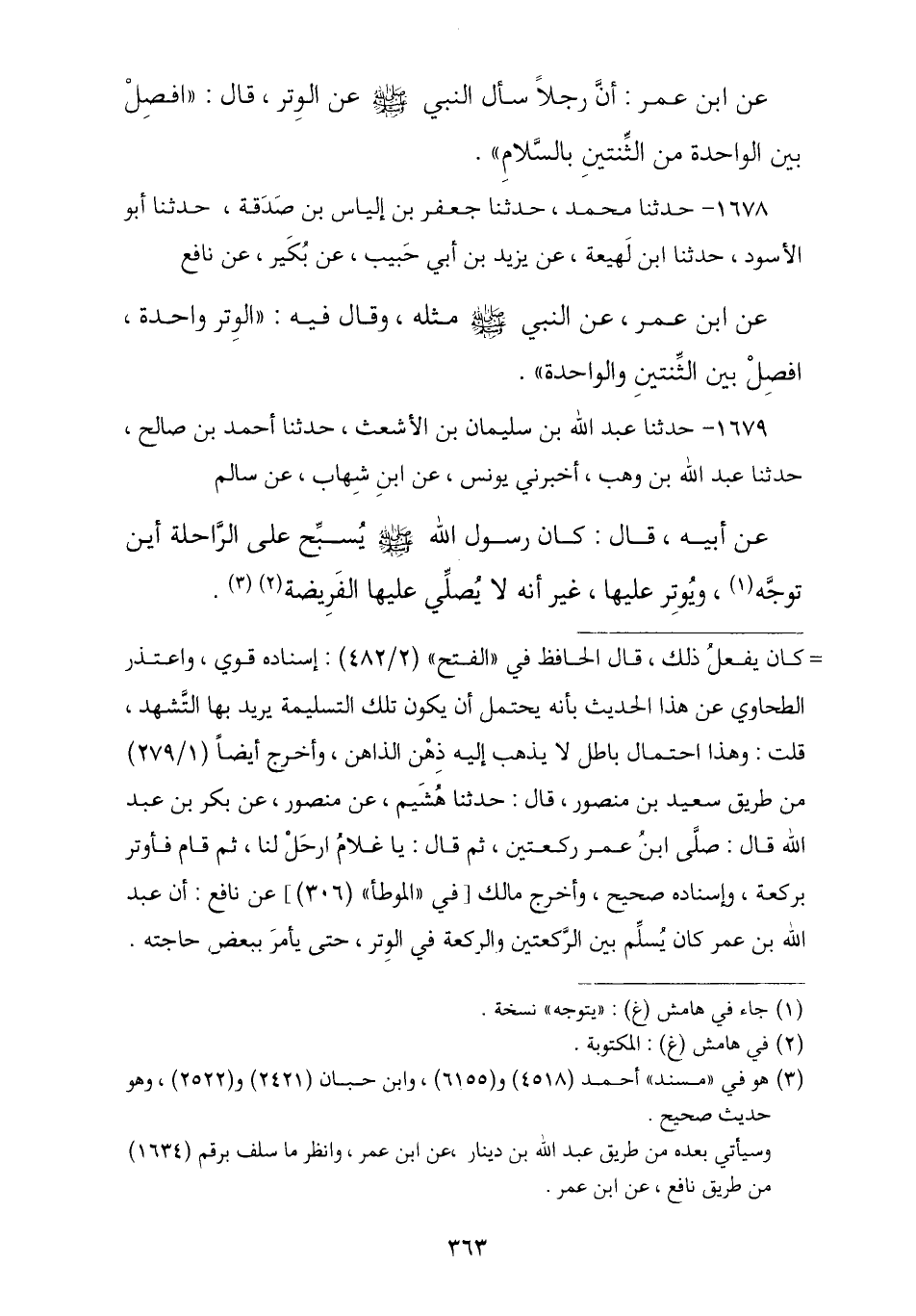 1679 - حَدَّثَنَا عَبْدُ اللَّهِ بْنُ سُلَيْمَانَ بْنِ الْأَشْعَثِ , ثنا أَحْمَدُ بْنُ صَالِحٍ , ثنا عَبْدُ اللَّهِ بْنُ وَهْبٍ , أَخْبَرَنِي يُونُسُ , عَنِ ابْنِ شِهَابٍ , عَنْ سَالِمٍ , عَنْ أَبِيهِ , قَالَ: كَانَ رَسُولُ اللَّهِ صَلَّى اللهُ عَلَيْهِ وَسَلَّمَ § «يُسَبِّحُ عَلَى الرَّاحِلَةِ أَيْنَ تَتَوَجَّهُ , وَيُوتِرُ عَلَيْهَا غَيْرَ أَنَّهُ كَانَ لَا يُصَلِّي عَلَيْهَا الْفَرِيضَةَ»