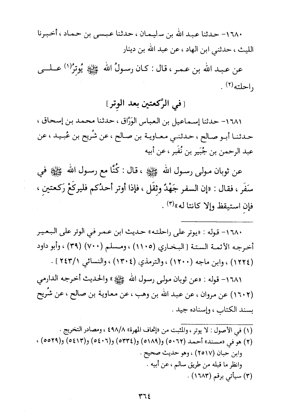 1680 - حَدَّثَنَا عَبْدُ اللَّهِ بْنُ سُلَيْمَانَ , ثنا عِيسَى بْنُ حَمَّادٍ , ثنا اللَّيْثُ , حَدَّثَنِي ابْنُ الْهَادِ , عَنْ عَبْدِ اللَّهِ بْنِ دِينَارٍ , عَنْ عَبْدِ اللَّهِ بْنِ عُمَرَ , قَالَ: كَانَ رَسُولُ اللَّهِ صَلَّى اللهُ عَلَيْهِ وَسَلَّمَ § «يُوتِرُ عَلَى رَاحِلَتِهِ»