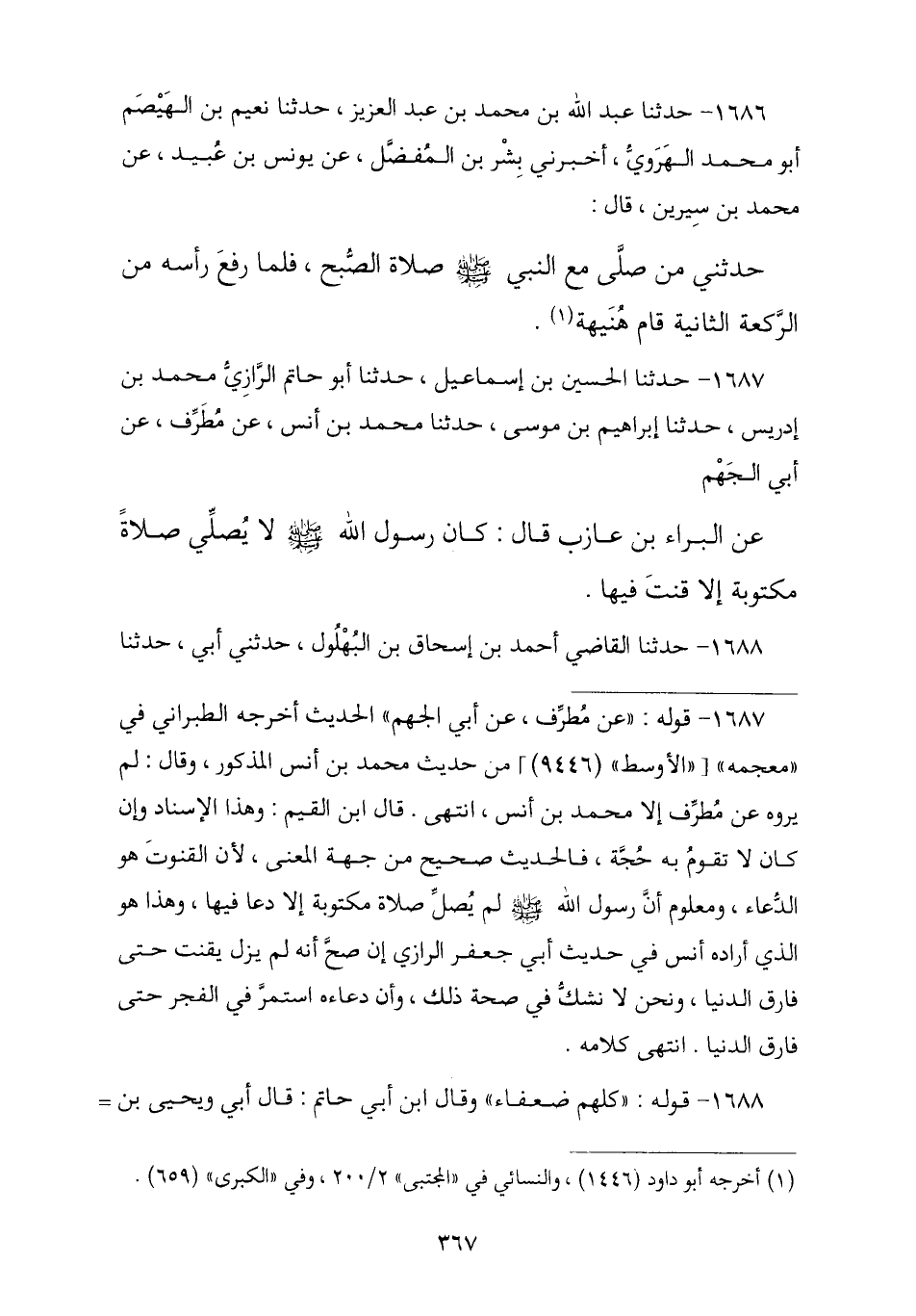 1687 - حَدَّثَنَا الْحُسَيْنُ بْنُ إِسْمَاعِيلَ , ثنا أَبُو حَاتِمٍ الرَّازِيُّ مُحَمَّدُ بْنُ إِدْرِيسَ , ثنا إِبْرَاهِيمُ بْنُ مُوسَى , ثنا مُحَمَّدُ بْنُ أَنَسٍ , عَنْ مُطَرِّفٍ , عَنْ أَبِي الْجَهْمِ , عَنِ الْبَرَاءِ بْنِ عَازِبٍ , قَالَ: كَانَ رَسُولُ اللَّهِ صَلَّى اللهُ عَلَيْهِ وَسَلَّمَ § «لَا يُصَلِّي صَلَاةً مَكْتُوبَةً إِلَّا قَنَتَ فِيهَا»