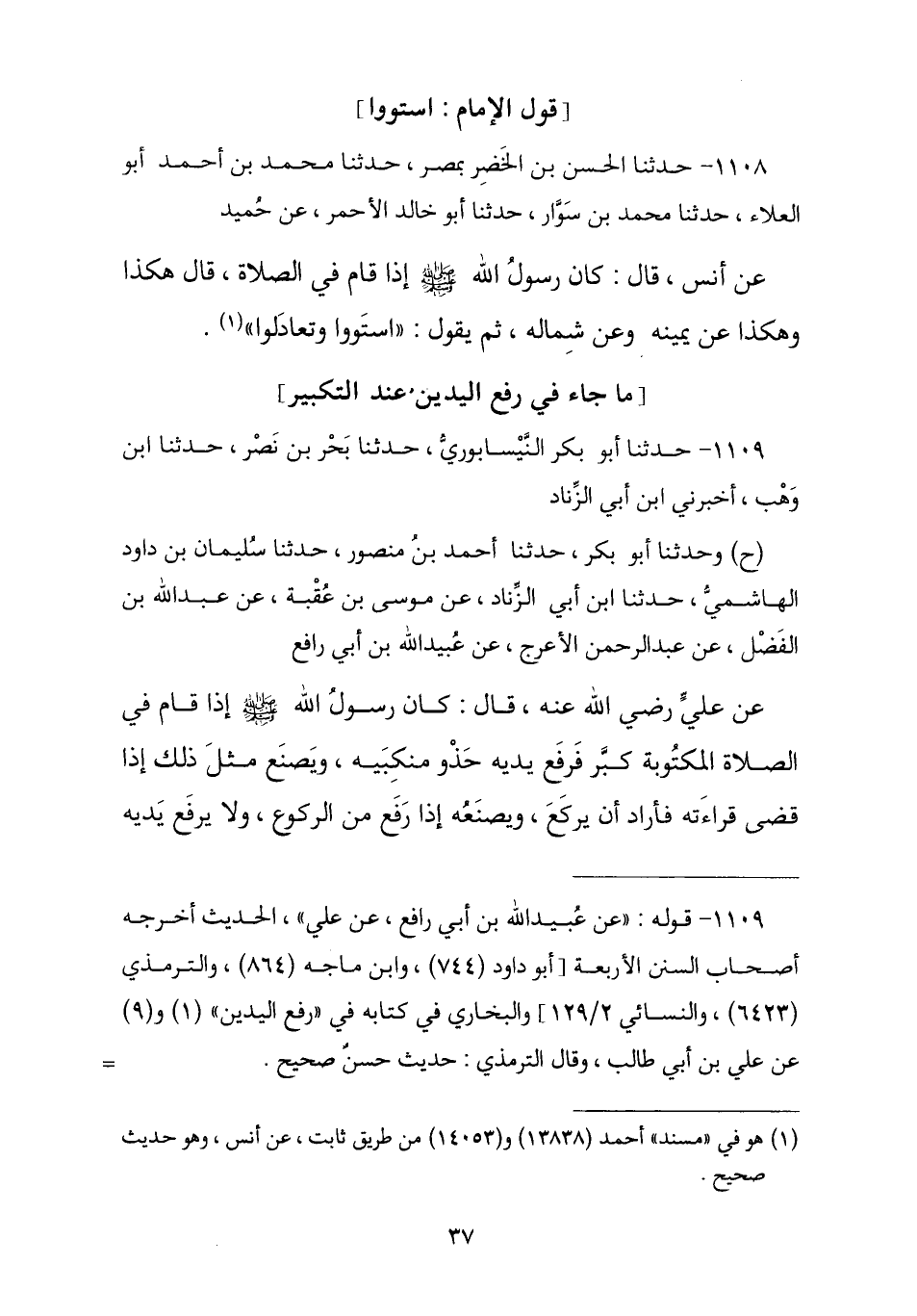 1108 - حَدَّثَنَا الْحَسَنُ بْنُ الْخَضِرِ بِمِصْرَ , ثنا مُحَمَّدُ بْنُ أَحْمَدَ أَبُو الْعَلَاءِ , ثنا مُحَمَّدُ بْنُ سَوَّارٍ , ثنا أَبُو خَالِدٍ الْأَحْمَرُ , عَنْ حُمَيْدٍ , عَنْ أَنَسٍ , قَالَ: كَانَ رَسُولُ اللَّهِ صَلَّى اللهُ عَلَيْهِ وَسَلَّمَ إِذَا قَامَ فِي الصَّلَاةِ قَالَ: وَهَكَذَا عَنْ يَمِينِهِ وَعَنْ شِمَالِهِ , ثُمَّ يَقُولُ: § «اسْتَوُوا اسْتَوُوا وَتَعَادَلُوا»