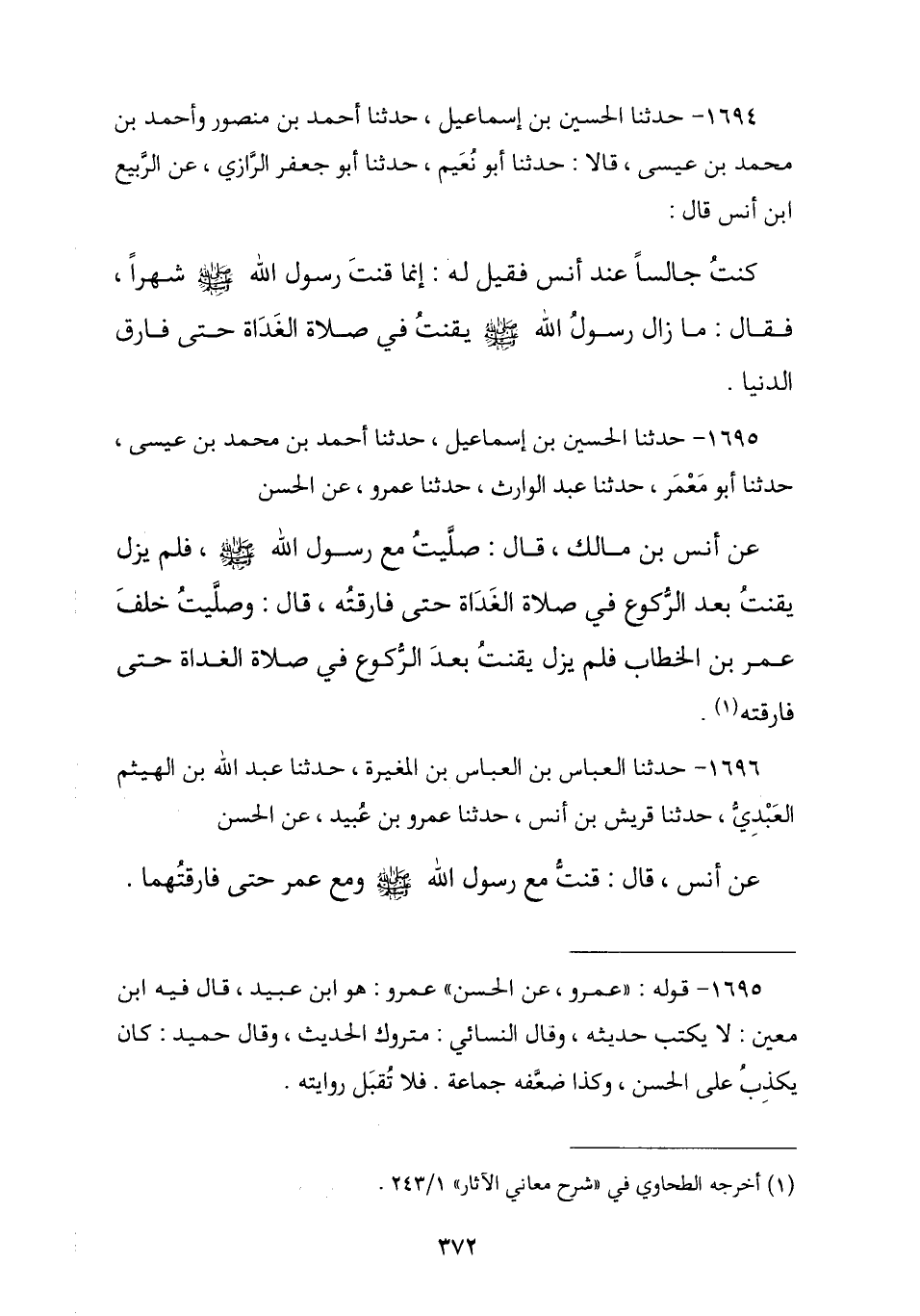 1696 - حَدَّثَنَا الْعَبَّاسُ بْنُ الْعَبَّاسِ بْنِ الْمُغِيرَةِ , ثنا عَبْدُ اللَّهِ بْنُ الْهَيْثَمِ الْعَبْدِيُّ , ثنا قُرَيْشُ بْنُ أَنَسٍ , عَنْ عَمْرِو بْنِ عُبَيْدٍ , عَنِ الْحَسَنِ , عَنْ أَنَسٍ , قَالَ: § «قَنَتُّ مَعَ رَسُولِ اللَّهِ صَلَّى اللهُ عَلَيْهِ وَسَلَّمَ وَعُمَرَ حَتَّى فَارَقْتُهُمَا»