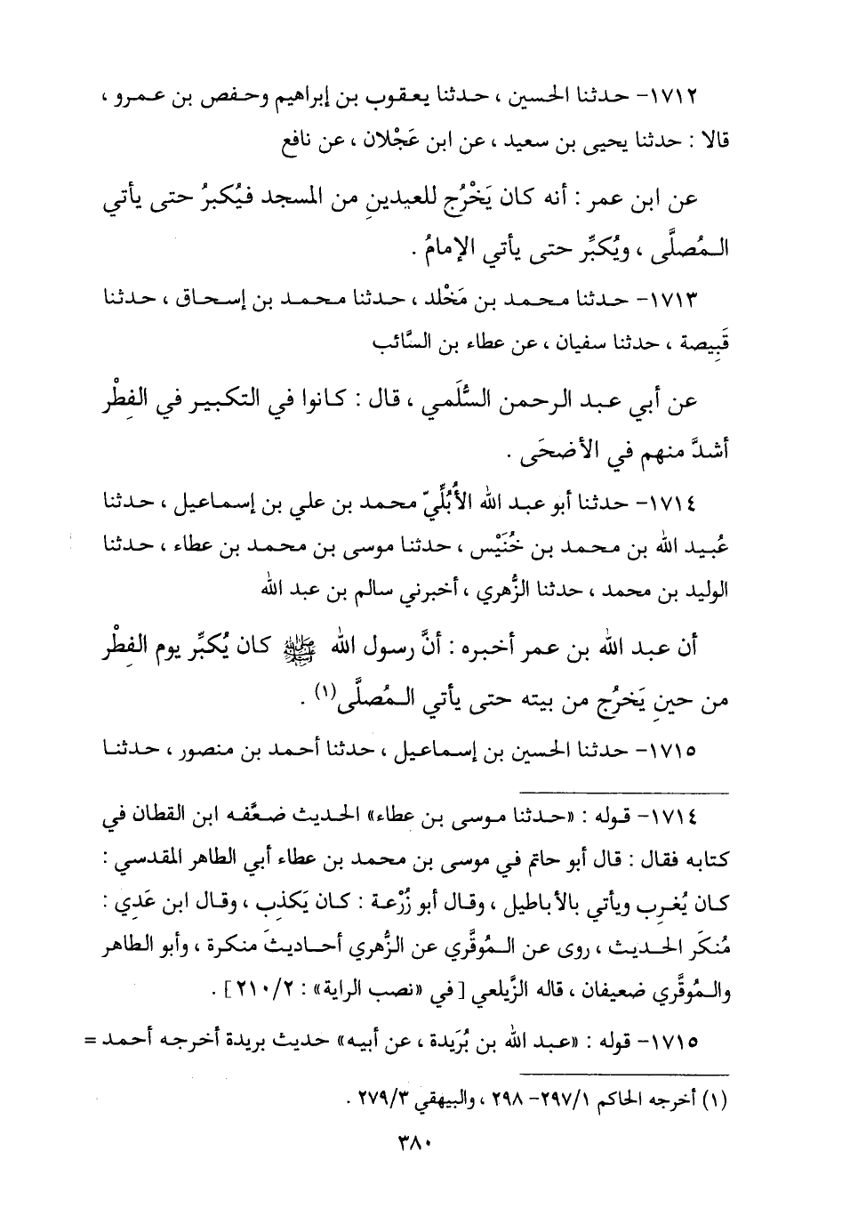 1712 - حَدَّثَنَا الْحُسَيْنُ , حَدَّثَنَا يَعْقُوبُ بْنُ إِبْرَاهِيمَ , وَحَفْصُ بْنُ عَمْرٍو , قَالَا: نا يَحْيَى بْنُ سَعِيدٍ , عَنِ ابْنِ عَجْلَانَ , عَنْ نَافِعٍ , عَنِ ابْنِ عُمَرَ «أَنَّهُ كَانَ §يَخْرُجُ لِلْعِيدَيْنِ مِنَ الْمَسْجِدِ فَيُكَبِّرُ حَتَّى يَأْتِيَ الْمُصَلَّى وَيُكَبِّرُ حَتَّى يَأْتِيَ الْإِمَامَ»
