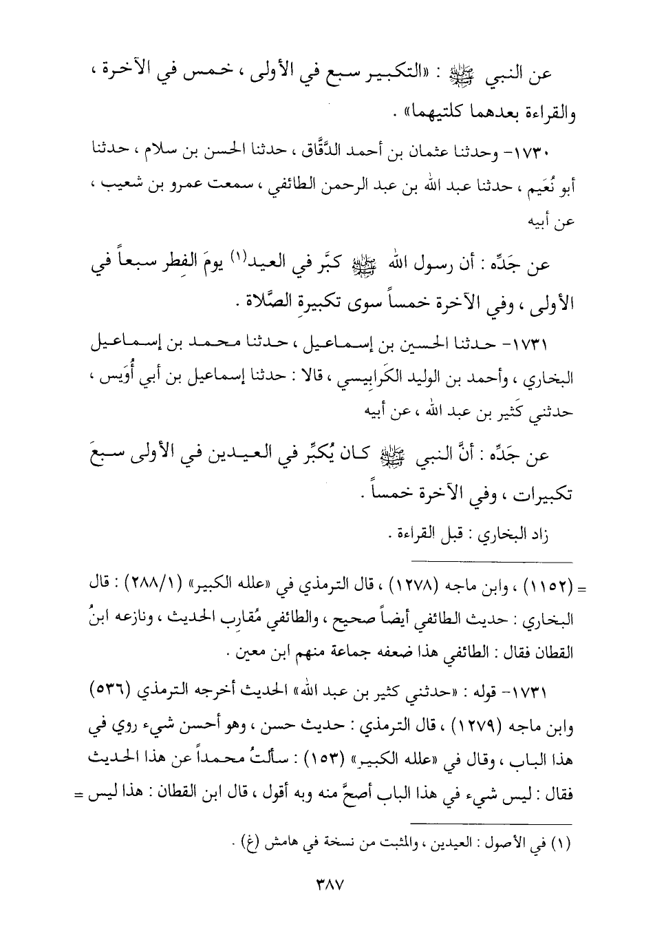 1731 - ثنا الْحُسَيْنُ بْنُ إِسْمَاعِيلَ , ثنا مُحَمَّدُ بْنُ إِسْمَاعِيلَ الْبُخَارِيُّ , وَأَحْمَدُ بْنُ الْوَلِيدِ الْكَرَابِيسِيُّ , قَالَا: نا إِسْمَاعِيلُ بْنُ أَبِي أُوَيْسٍ , حَدَّثَنِي كَثِيرُ بْنُ عَبْدِ اللَّهِ , عَنْ أَبِيهِ , عَنْ جَدِّهِ , أَنَّ النَّبِيَّ صَلَّى اللهُ عَلَيْهِ وَسَلَّمَ كَانَ § «يُكَبِّرُ فِي الْعِيدَيْنِ فِي الْأُولَى سَبْعَ تَكْبِيرَاتٍ وَفِي الْآخِرَةِ خَمْسًا». زَادَ الْبُخَارِيُّ: «قَبْلَ الْقِرَاءَةِ»