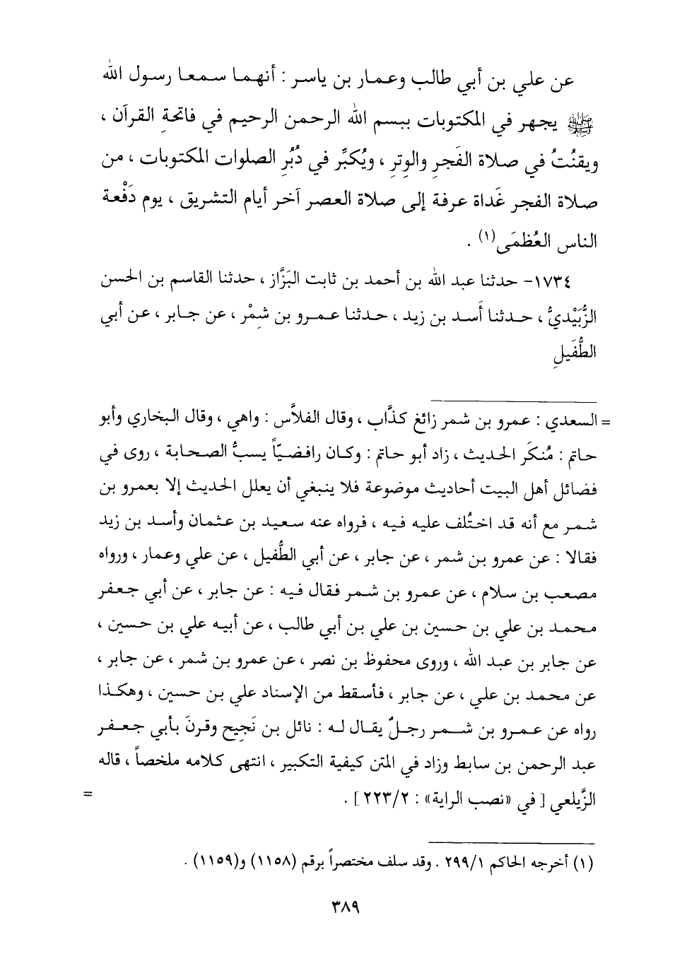 1734 - حَدَّثَنَا عَبْدُ اللَّهِ بْنُ أَحْمَدَ بْنِ ثَابِتٍ الْبَزَّازُ , ثنا الْقَاسِمُ بْنُ الْحَسَنِ الزُّبَيْدِيُّ , ثنا أُسَيدُ بْنُ زَيْدٍ , ثنا عَمْرُو بْنُ شِمْرٍ , عَنْ جَابِرٍ , عَنْ أَبِي الطُّفَيْلِ , -[390]- عَنْ عَلِيٍّ , وَعَمَّارٍ , أَنَّ النَّبِيَّ صَلَّى اللهُ عَلَيْهِ وَسَلَّمَ" كَانَ §يَجْهَرُ فِي الْمَكْتُوبَاتِ بِـ {بِسْمِ اللَّهِ الرَّحْمَنِ الرَّحِيمِ} [الفاتحة: 1] , وَكَانَ يَقْنُتُ فِي الْفَجْرِ , وَكَانَ يُكَبِّرُ يَوْمَ عَرَفَةَ صَلَاةَ الْغَدَاةِ , وَيَقْطَعُهَا صَلَاةَ الْعَصْرِ آخِرَ أَيَّامِ التَّشْرِيقِ"