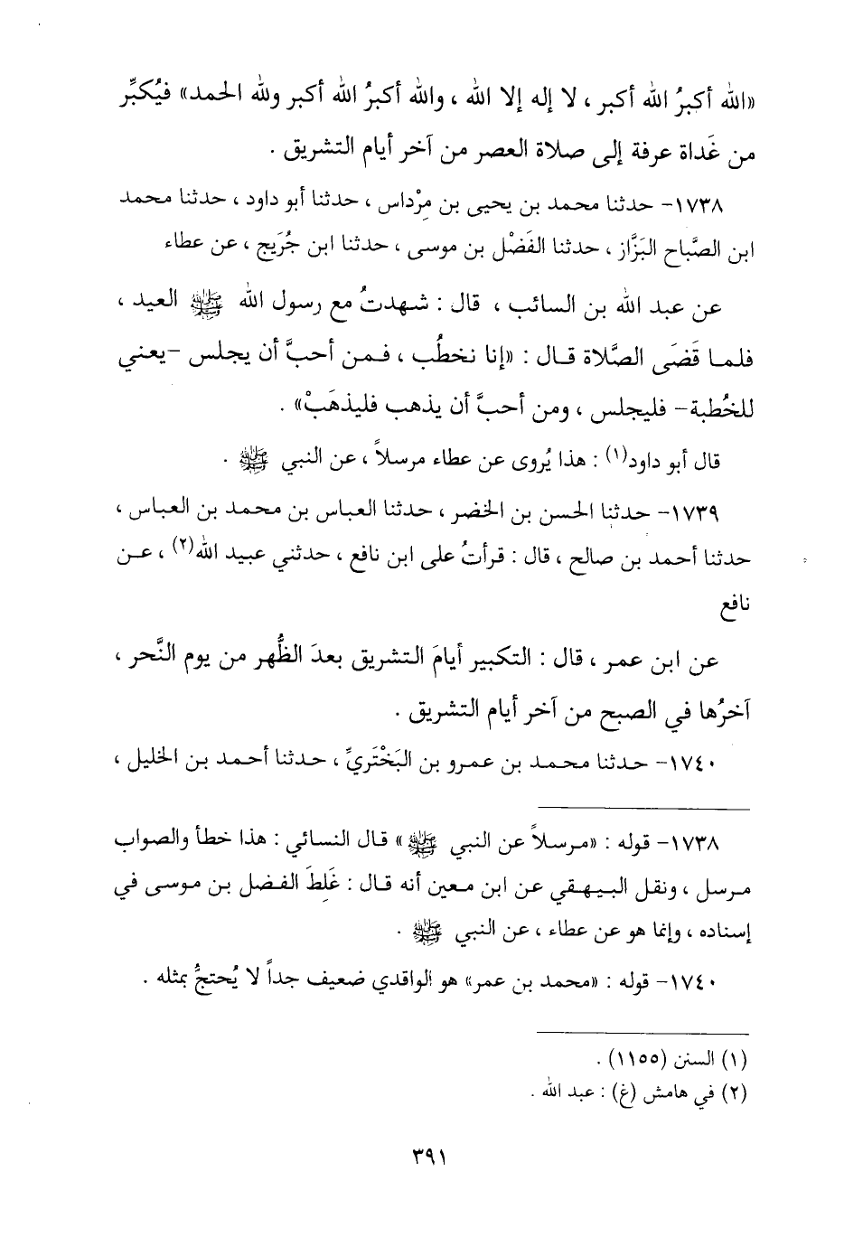 1739 - حَدَّثَنَا الْحَسَنُ بْنُ الْخَضِرِ , ثنا عَبَّاسُ بْنُ مُحَمَّدِ بْنِ الْعَبَّاسِ الْبَصْرِيُّ , حَدَّثَنَا أَحْمَدُ بْنُ صَالِحٍ , قَالَ: قَرَأْتُ عَلَى ابْنِ نَافِعٍ , حَدَّثَنِي عَبْدُ اللَّهِ , عْنُ نَافِعٍ , عَنِ ابْنِ عُمَرَ , قَالَ: § «التَّكْبِيرُ أَيَّامَ التَّشْرِيقِ بَعْدَ الظُّهْرِ مِنْ يَوْمِ النَّحْرِ , آخِرُهَا فِي الصُّبْحِ مِنْ آخِرِ أَيَّامِ التَّشْرِيقِ»