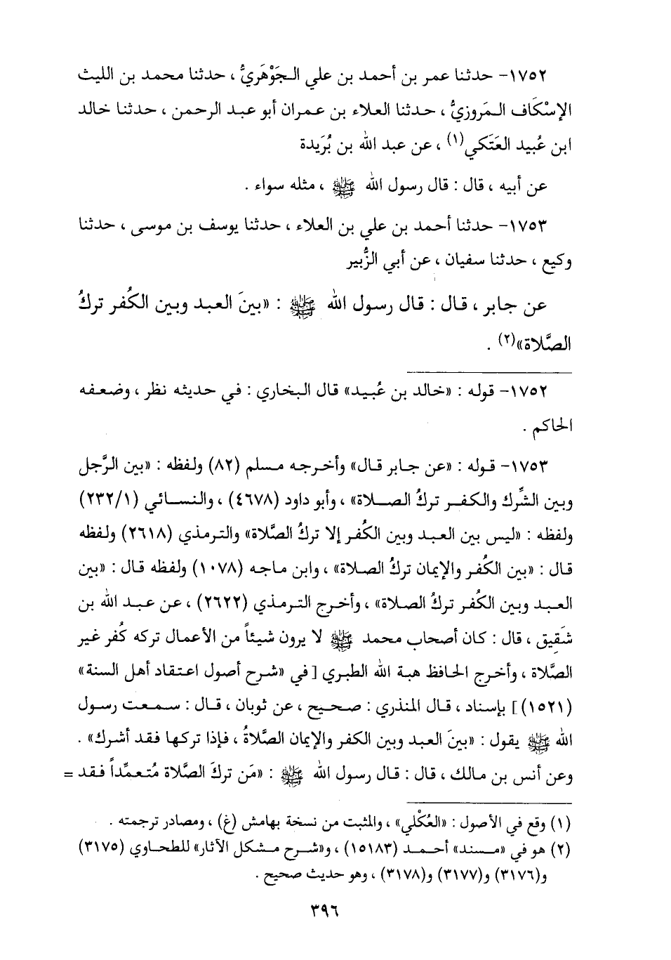 1753 - وَحَدَّثَنَا أَحْمَدُ بْنُ عَلِيِّ بْنِ الْعَلَاءِ , ثنا يُوسُفُ بْنُ مُوسَى , ثنا وَكِيعٌ , ثنا سُفْيَانُ , عَنْ أَبِي الزُّبَيْرِ , عَنْ جَابِرٍ , قَالَ: قَالَ رَسُولُ اللَّهِ صَلَّى اللهُ عَلَيْهِ وَسَلَّمَ: § «بَيْنَ الْعَبْدِ وَبَيْنَ الْكُفْرِ تَرْكُ الصَّلَاةِ»