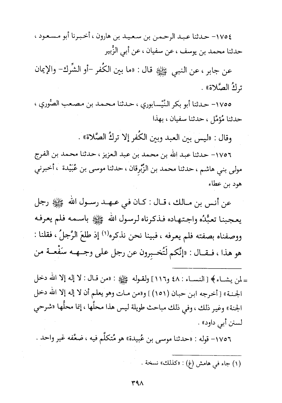 1754 - حَدَّثَنَا عَبْدُ الرَّحْمَنِ بْنُ سَعِيدِ بْنِ هَارُونَ , أنا أَبُو مَسْعُودٍ , ثنا مُحَمَّدُ بْنُ يُوسُفَ , ثنا سُفْيَانُ , عَنْ أَبِي الزُّبَيْرِ , عَنْ جَابِرٍ , عَنِ النَّبِيِّ صَلَّى اللهُ عَلَيْهِ وَسَلَّمَ قَالَ: § «مَا بَيْنَ الْكُفْرِ أَوِ الشِّرْكِ وَالْإِيمَانِ تَرْكُ الصَّلَاةِ»