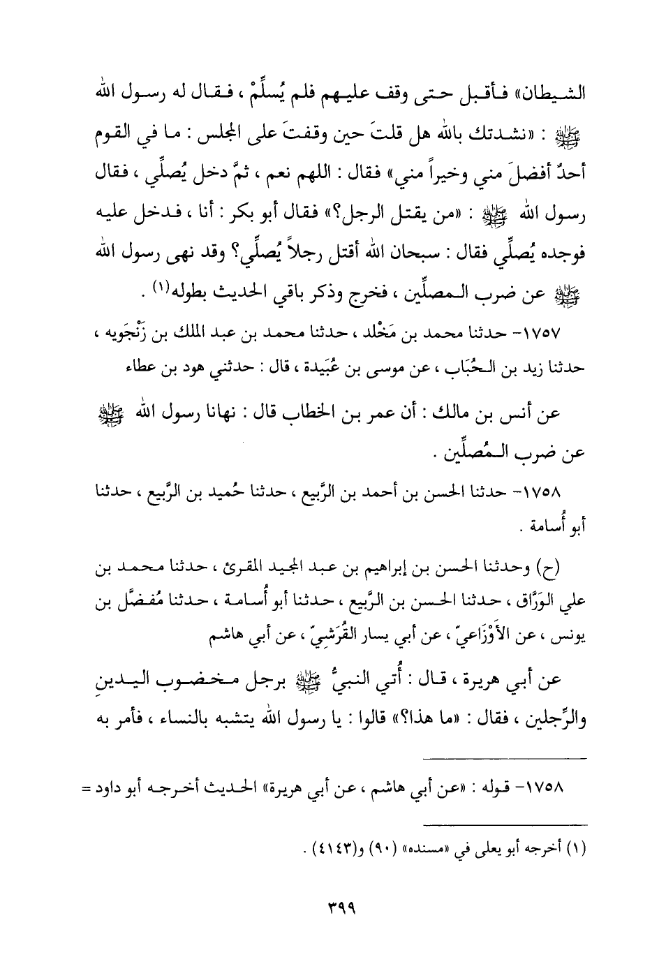 1758 - حَدَّثَنَا الْحَسَنُ بْنُ أَحْمَدَ بْنِ الرَّبِيعِ , ثنا حُمَيْدُ بْنُ الرَّبِيعِ , ثنا أَبُو أُسَامَةَ , ح وَحَدَّثَنَا الْحَسَنُ بْنُ إِبْرَاهِيمَ بْنِ عَبْدِ الْمَجِيدِ الْمُقْرِئُ , حَدَّثَنَا مُحَمَّدُ بْنُ عَلِيٍّ الْوَرَّاقُ , ثنا الْحَسَنُ بْنُ الرَّبِيعِ , ثنا أَبُو أُسَامَةَ , ثنا مُفَضَّلُ بْنُ يُونُسَ، عَنِ الْأَوْزَاعِيِّ , عَنْ أَبِي يَسَارٍ الْقُرَشِيِّ , عَنْ أَبِي هَاشِمٍ , عَنْ أَبِي هُرَيْرَةَ , قَالَ: أُتِيَ النَّبِيُّ صَلَّى اللهُ عَلَيْهِ وَسَلَّمَ بِرَجُلٍ مَخْضُوبِ الْيَدَيْنِ وَالرِّجْلَيْنِ , فَقَالَ: «مَا هَذَا؟» , فَقَالُوا: يَا رَسُولَ اللَّهِ يَتَشَبَّهُ بِالنِّسَاءِ , فَأَمَرَ بِهِ -[400]- فَنُحِّيَ عَنِ الْمَدِينَةِ إِلَى مَكَانٍ يُقَالُ لَهُ: النَّقِيعُ وَلَيْسَ بِالْبَقِيعِ , فَقِيلَ: يَا رَسُولَ اللَّهِ أَلَا نَقْتُلُهُ , فَقَالَ: «لَا §إِنِّي نُهِيتُ عَنْ قَتْلِ الْمُصَلِّينَ». وَقَالَ حُمَيْدُ بْنُ الرَّبِيعِ: أُتِيَ بِمُخَنَّثٍ قَدْ خَضَبَ يَدَيْهِ وَرِجْلَيْهِ