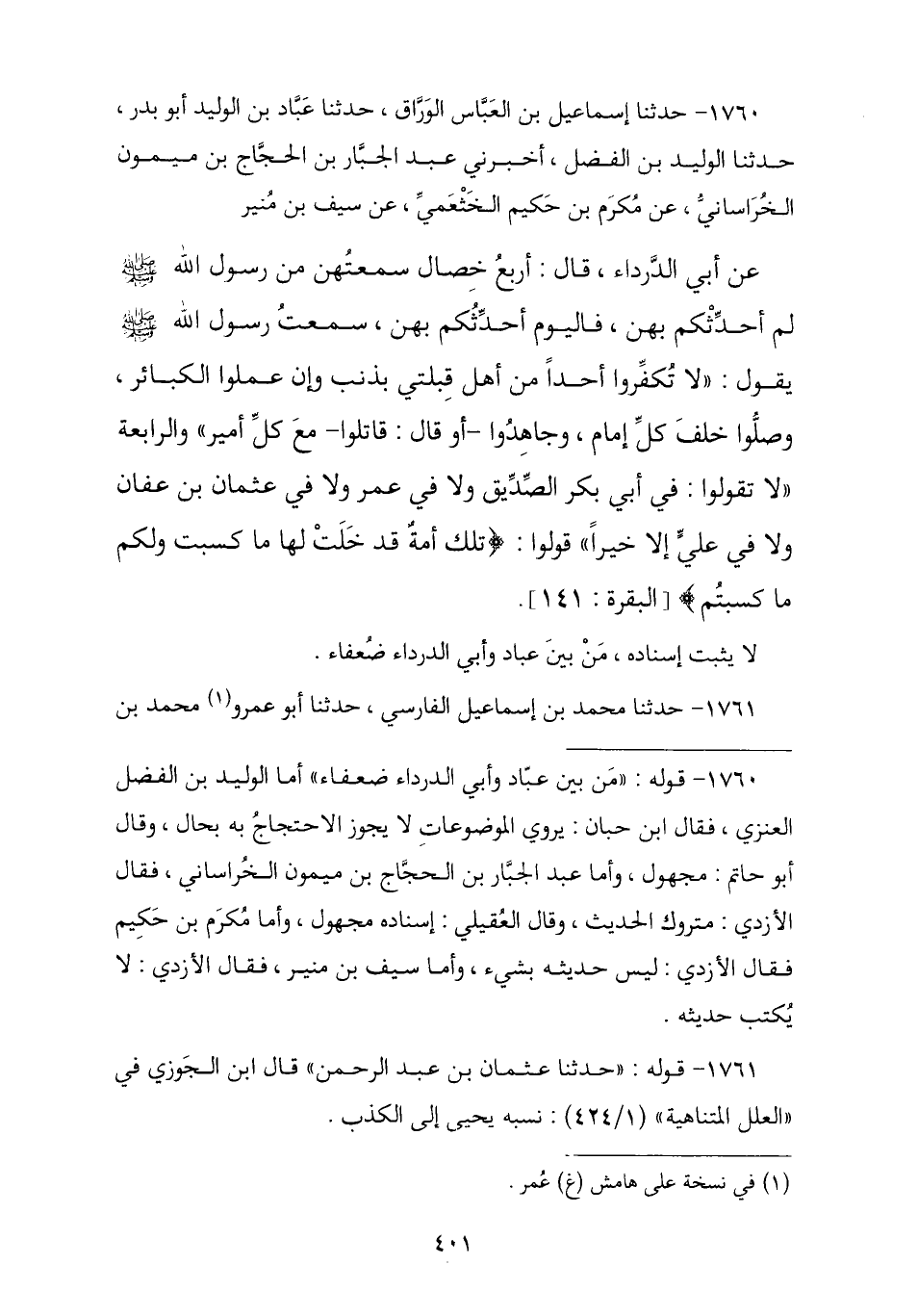 1760 - حَدَّثَنَا إِسْمَاعِيلُ بْنُ الْعَبَّاسِ الْوَرَّاقُ , ثنا عَبَّادُ بْنُ الْوَلِيدِ أَبُو بَدْرٍ , ثنا الْوَلِيدُ بْنُ الْفَضْلِ , أَخْبَرَنِي عَبْدُ الْجَبَّارِ بْنُ الْحَجَّاجِ بْنِ مَيْمُونٍ الْخُرَاسَانِيُّ , عَنْ مُكْرَمِ بْنِ حَكِيمٍ الْخَثْعَمِيِّ , عَنْ سَيْفِ بْنِ مُنِيرٍ , عَنْ أَبِي الدَّرْدَاءِ , قَالَ: أَرْبَعُ خِصَالٍ سَمِعْتُهُنَّ مِنْ رَسُولِ اللَّهِ صَلَّى اللهُ عَلَيْهِ وَسَلَّمَ لَمْ أُحَدِّثْكُمْ بِهِنَّ فَالْيَوْمَ أُحَدِّثُكُمْ بِهِنَّ , سَمِعْتُ رَسُولَ اللَّهِ صَلَّى اللهُ عَلَيْهِ وَسَلَّمَ يَقُولُ: § «لَا تُكَفِّرُوا أَحَدًا مِنْ أَهْلِ قِبْلَتِي بِذَنْبٍ وَإِنْ عَمِلُوا الْكَبَائِرَ , وَصَلُّوا خَلْفَ كُلِّ إِمَامٍ , وَجَاهِدُوا» أَوْ قَالَ: " قَاتِلُوا مَعَ كُلِّ أَمِيرٍ , وَالرَّابِعَةُ: لَا تَقُولُوا فِي أَبِي بَكْرٍ الصِّدِّيقِ وَلَا فِي عُمَرَ وَلَا فِي عُثْمَانَ وَلَا فِي عَلِيٍّ إِلَّا خَيْرًا , قُولُوا {تِلْكَ أُمَّةٌ قَدْ خَلَتْ لَهَا مَا كَسَبَتْ وَلَكُمْ مَا كَسَبْتُمْ} [البقرة: 134] ". وَلَا يُثْبَتُ إِسْنَادُهُ , مَنْ بَيْنَ عَبَّادٍ وَأَبِي الدَّرْدَاءِ ضُعَفَاءُ