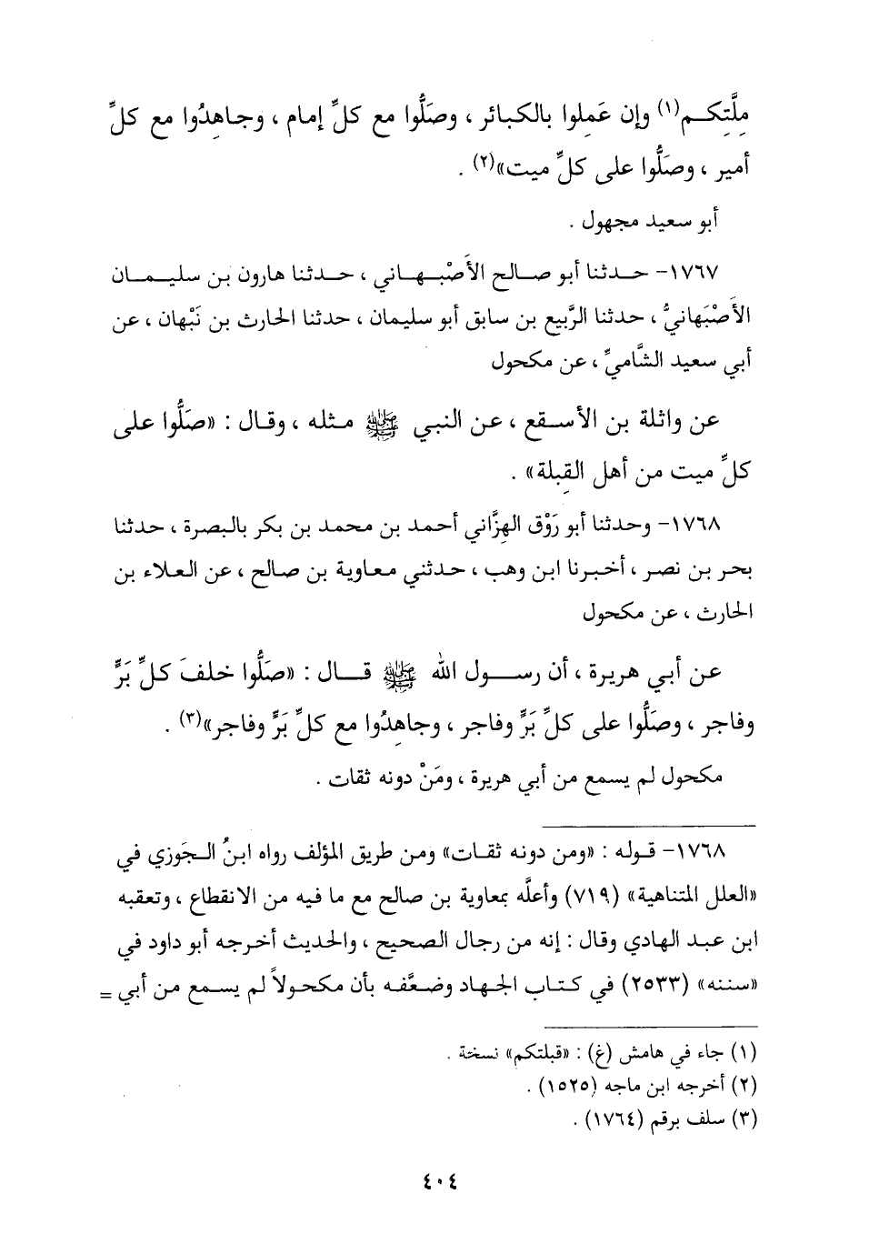 1768 - وَحَدَّثَنَا أَبُو رَوْقٍ الْهِزَّانِيُّ أَحْمَدُ بْنُ مُحَمَّدِ بْنِ بَكْرٍ بِالْبَصْرَةِ , ثنا بَحْرُ بْنُ نَصْرٍ , ثنا ابْنُ وَهْبٍ , حَدَّثَنِي مُعَاوِيَةُ بْنُ صَالِحٍ , عَنِ الْعَلَاءِ بْنِ الْحَارِثِ , عَنْ مَكْحُولٍ , عَنْ أَبِي هُرَيْرَةَ , أَنَّ رَسُولَ اللَّهِ صَلَّى اللهُ عَلَيْهِ وَسَلَّمَ قَالَ: § «صَلُّوا خَلْفَ كُلِّ بَرٍّ وَفَاجِرٍ , وَصَلُّوا عَلَى كُلِّ بَرٍّ وَفَاجِرٍ , وَجَاهِدُوا مَعَ كُلِّ بَرٍّ وَفَاجِرٍ». مَكْحُولٌ لَمْ يَسْمَعْ مِنْ أَبِي هُرَيْرَةَ وَمَنْ دُونَهُ ثِقَاتٌ