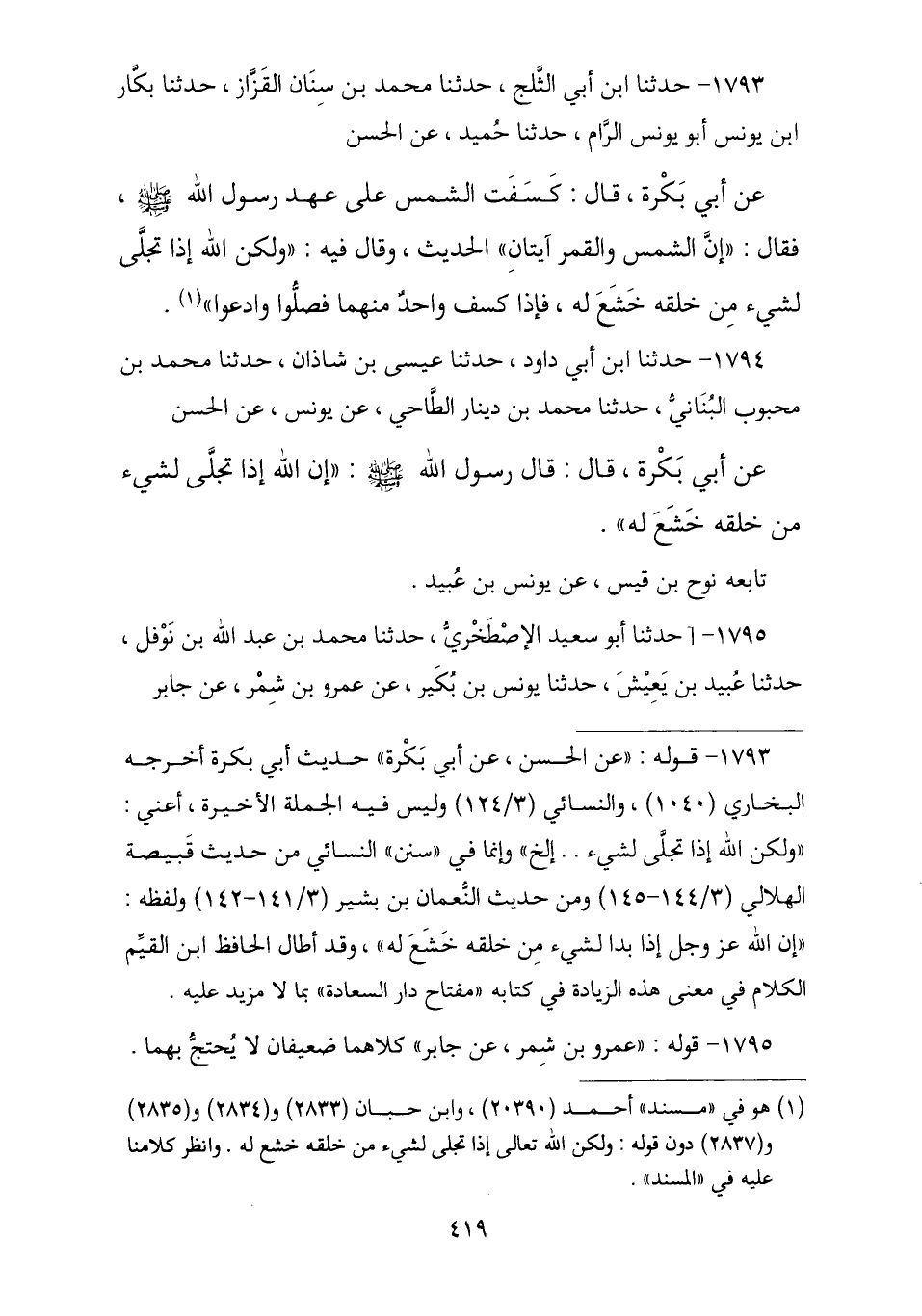 1793 - حَدَّثَنَا ابْنُ أَبِي الثَّلْجِ , ثنا مُحَمَّدُ بْنُ سِنَانٍ الْقَزَّازُ , ثنا بَكَّارُ بْنُ يُونُسَ أَبُو يُونُسَ الرَّامِي , ثنا حُمَيْدٌ , عَنِ الْحَسَنِ , عَنْ أَبِي بَكْرَةَ , قَالَ: كَسَفَتِ الشَّمْسُ فِي عَهْدِ رَسُولِ اللَّهِ صَلَّى اللهُ عَلَيْهِ وَسَلَّمَ فَقَالَ: «إِنَّ §الشَّمْسَ وَالْقَمَرَ آيَتَانِ» الْحَدِيثَ , وَقَالَ فِيهِ: «وَلَكِنَّ اللَّهَ إِذَا تَجَلَّى لِشَيْءٍ مِنْ خَلْقِهِ خَشَعَ لَهُ فَإِذَا كَسَفَ وَاحِدٌ مِنْهُمَا فَصَلُّوا وَادْعُوا»