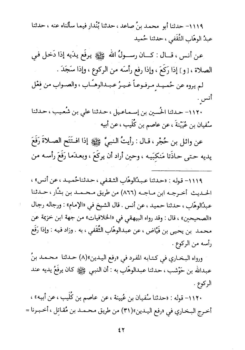 1119 - حَدَّثَنَا أَبُو مُحَمَّدِ بْنُ صَاعِدٍ , ثنا بُنْدَارٌ فِيمَا سَأَلْنَاهُ عَنْهُ , ثنا عَبْدُ الْوَهَّابِ الثَّقَفِيُّ , ثنا حُمَيْدٌ , عَنْ أَنَسٍ , قَالَ: «كَانَ رَسُولُ اللَّهِ صَلَّى اللهُ عَلَيْهِ وَسَلَّمَ §يَرْفَعُ يَدَيْهِ إِذَا دَخَلَ فِي الصَّلَاةِ وَإِذَا رَكَعَ وَإِذَا رَفَعَ رَأْسَهُ مِنَ الرُّكُوعِ وَإِذَا سَجَدَ». لَمْ يَرْوِهِ عَنْ حُمَيْدٍ مَرْفُوعًا غَيْرُ عَبْدِ الْوَهَّابِ , وَالصَّوَابُ مِنْ فِعْلِ أَنَسٍ