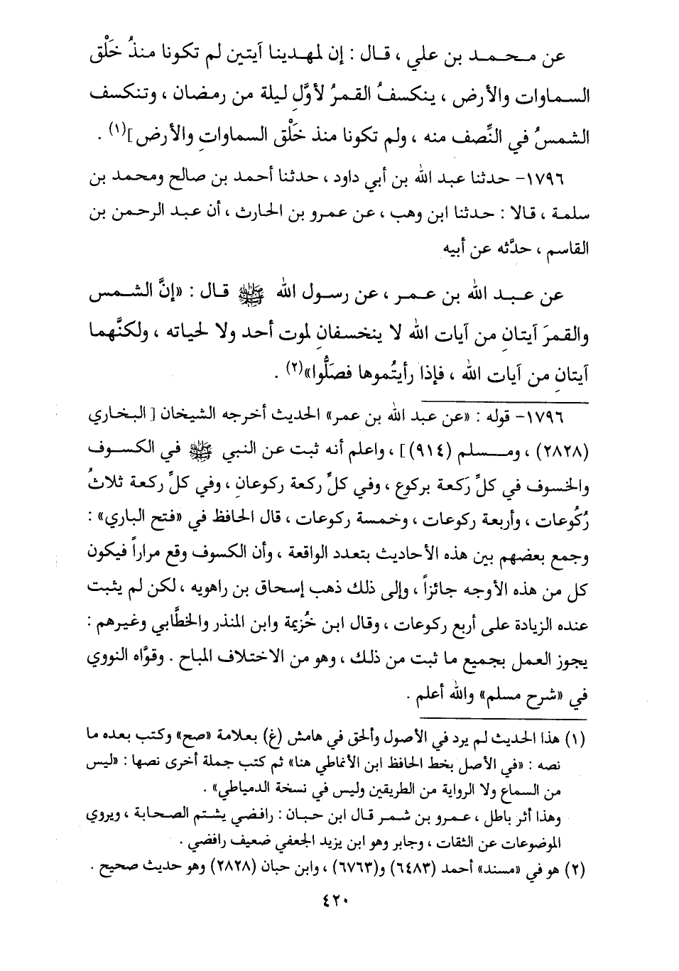 1796 - حَدَّثَنَا ابْنُ أَبِي دَاوُدَ , ثنا أَحْمَدُ بْنُ صَالِحٍ , وَمُحَمَّدُ بْنُ سَلَمَةَ , قَالَا: نا ابْنُ وَهْبٍ , عَنْ عَمْرِو بْنِ الْحَارِثِ , أَنَّ عَبْدَ الرَّحْمَنِ بْنَ الْقَاسِمِ حَدَّثَهُ , عَنْ أَبِيهِ , عَنْ عَبْدِ اللَّهِ بْنِ عُمَرَ , عَنْ رَسُولِ اللَّهِ صَلَّى اللهُ عَلَيْهِ وَسَلَّمَ قَالَ: «إِنَّ §الشَّمْسَ وَالْقَمَرَ آيَتَانِ مِنْ آيَاتِ اللَّهِ لَا يَنْخَسِفَانِ لِمَوْتِ أَحَدٍ وَلَا لِحَيَاتِهِ وَلَكِنَّهُمَا آيَتَانِ مِنْ آيَاتِ اللَّهِ فَإِذَا رَأَيْتُمُوهَا فَصَلُّوا»