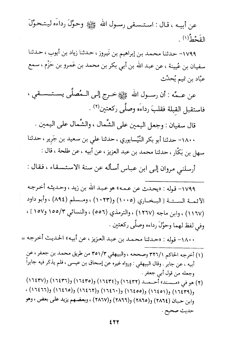 1799 - حَدَّثَنَا مُحَمَّدُ بْنُ إِبْرَاهِيمَ بْنِ نَيْرُوزٍ , ثنا زِيَادُ بْنُ أَيُّوبَ , نا سُفْيَانُ بْنُ عُيَيْنَةَ , عَنْ عَبْدِ اللَّهِ بْنِ أَبِي بَكْرِ بْنِ مُحَمَّدِ بْنِ عَمْرِو بْنِ حَزْمٍ , سَمِعَ عَبَّادَ بْنَ تَمِيمٍ , يُحَدِّثُ عَنْ عَمِّهِ , أَنَّ رَسُولَ اللَّهِ صَلَّى اللهُ عَلَيْهِ وَسَلَّمَ «خَرَجَ إِلَى الْمُصَلَّى يَسْتَسْقِي §فَاسْتَقْبَلَ الْقِبْلَةَ فَقَلَبَ رِدَاءَهُ وَصَلَّى رَكْعَتَيْنِ». قَالَ سُفْيَانُ: جَعَلَ الْيَمِينَ عَلَى الشِّمَالِ وَالشِّمَالَ عَلَى الْيَمِينِ