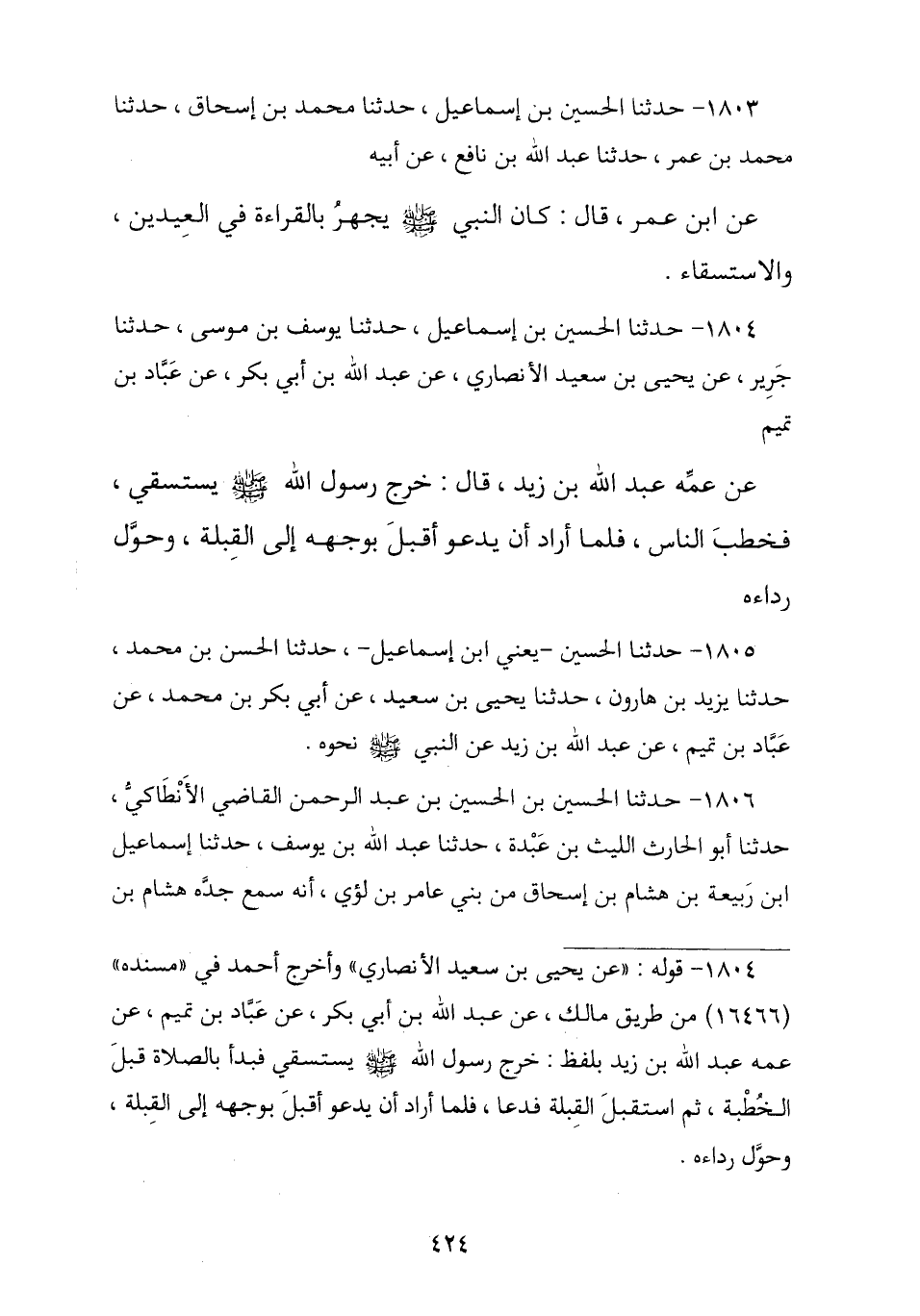 1804 - حَدَّثَنَا الْحُسَيْنُ بْنُ إِسْمَاعِيلَ , ثنا يُوسُفُ بْنُ مُوسَى , ثنا جَرِيرٌ , عَنْ يَحْيَى بْنِ سَعِيدٍ الْأَنْصَارِيِّ , عَنْ عَبْدِ اللَّهِ بْنِ أَبِي بَكْرٍ , عَنْ عَبَّادِ بْنِ تَمِيمٍ , عَنْ عَمِّهِ عَبْدِ اللَّهِ بْنِ زَيْدٍ , قَالَ: «خَرَجَ رَسُولُ اللَّهِ صَلَّى اللهُ عَلَيْهِ وَسَلَّمَ يَسْتَسْقِي , فَخَطَبَ النَّاسَ فَلَمَّا أَرَادَ أَنْ يَدْعُوَ أَقْبَلَ بِوَجْهِهِ إِلَى الْقِبْلَةِ §وَحَوَّلَ رِدَاءَهُ».