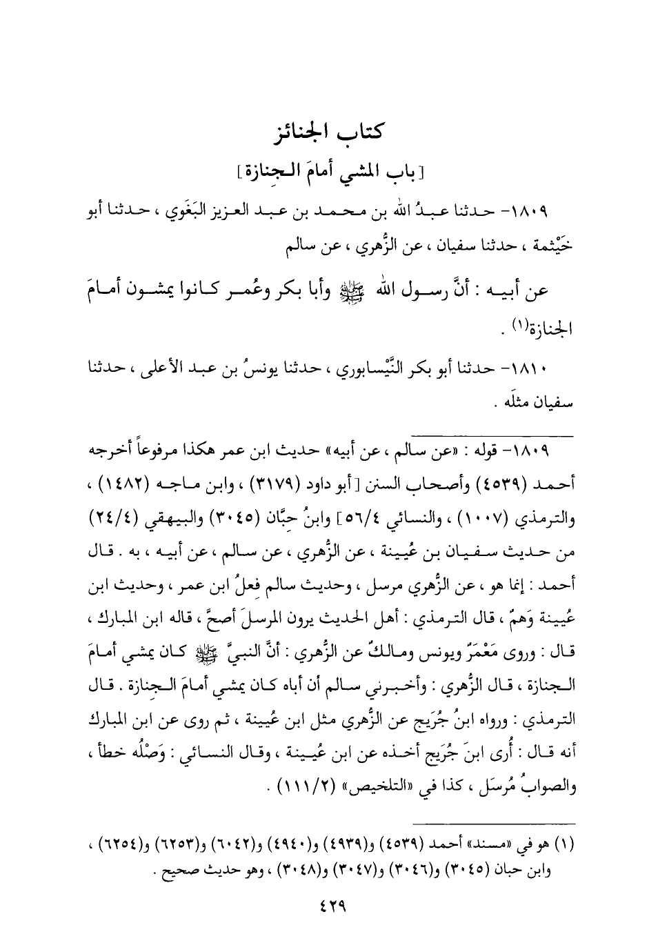 1809 - حَدَّثَنَا عَبْدُ اللَّهِ بْنُ مُحَمَّدِ بْنِ عَبْدِ الْعَزِيزِ , ثنا أَبُو خَيْثَمَةَ , ثنا سُفْيَانُ , عَنِ الزُّهْرِيِّ , عَنْ سَالِمٍ , عَنْ أَبِيهِ , أَنَّ رَسُولَ اللَّهِ صَلَّى اللهُ عَلَيْهِ وَسَلَّمَ , وَأَبَا بَكْرٍ , وَعُمَرَ § «كَانُوا يَمْشُونَ أَمَامَ الْجَنَائِزِ».