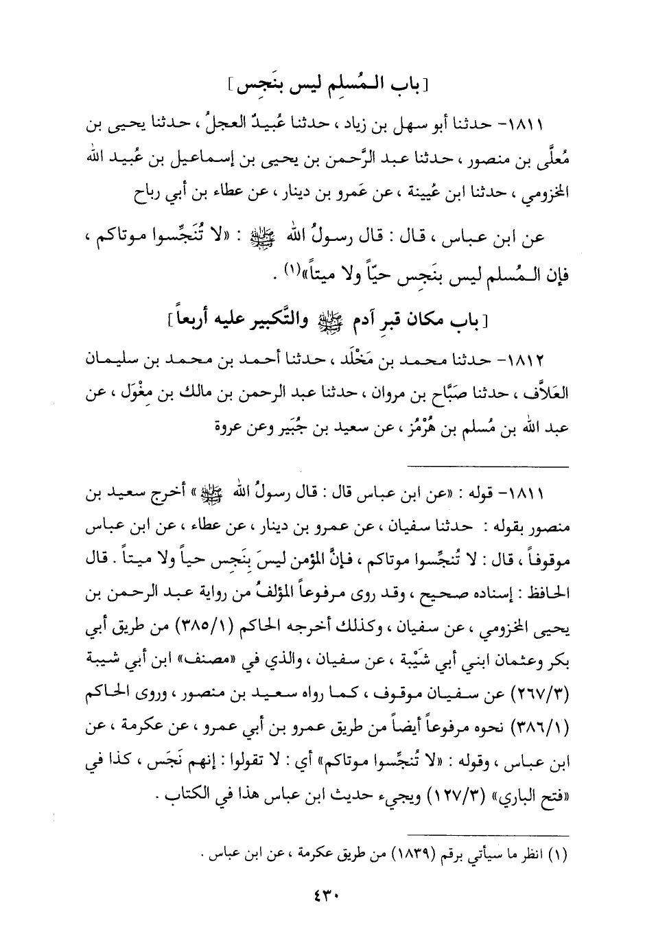 1811 - حَدَّثَنَا أَبُو سَهْلِ بْنُ زِيَادٍ , ثنا عُبَيْدٌ الْعِجْلُ , ثنا يَحْيَى بْنُ مُعَلَّى بْنِ مَنْصُورٍ , ثنا عَبْدُ الرَّحْمَنِ بْنُ يَحْيَى بْنِ إِسْمَاعِيلَ بْنِ عُبَيْدِ اللَّهِ الْمَخْزُومِيُّ , حَدَّثَنَا ابْنُ عُيَيْنَةَ , عَنْ عَمْرِو بْنِ دِينَارٍ , عَنْ عَطَاءِ بْنِ أَبِي رَبَاحٍ , عَنِ ابْنِ عَبَّاسٍ , قَالَ: قَالَ رَسُولُ اللَّهِ صَلَّى اللهُ عَلَيْهِ وَسَلَّمَ: § «لَا تُنَجِّسُوا مَوْتَاكُمْ فَإِنَّ الْمُسْلِمَ لَيْسَ بِنَجَسٍ حَيًّا وَلَا مَيِّتًا»