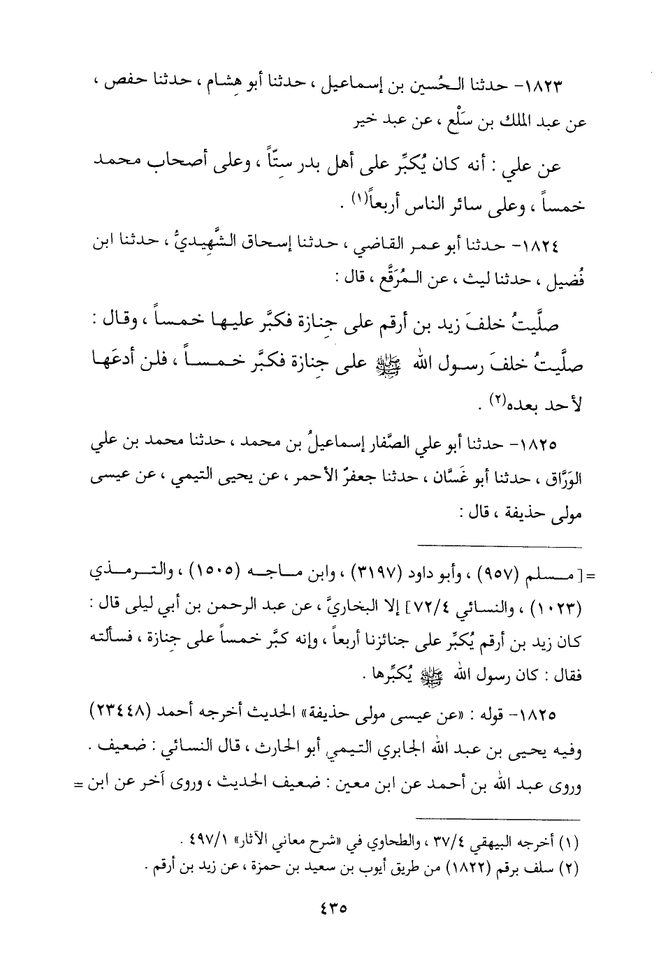1824 - حَدَّثَنَا أَبُو عُمَرَ الْقَاضِي , حَدَّثَنَا إِسْحَاقُ الشَّهِيدِيُّ , ثنا ابْنُ فُضَيْلٍ , نا لَيْثٌ , عَنِ الْمُرَقَّعِ , قَالَ: صَلَّيْتُ خَلْفَ زَيْدِ بْنِ أَرْقَمَ عَلَى جِنَازَةٍ فَكَبَّرَ عَلَيْهَا خَمْسًا , وَقَالَ: «صَلَّيْتُ خَلْفَ رَسُولِ اللَّهِ صَلَّى اللهُ عَلَيْهِ وَسَلَّمَ عَلَى جِنَازَةٍ §فَكَبَّرَ خَمْسًا فَإِنِّي لَا أَدَعُهَا لِأَحَدٍ بَعْدَهُ»