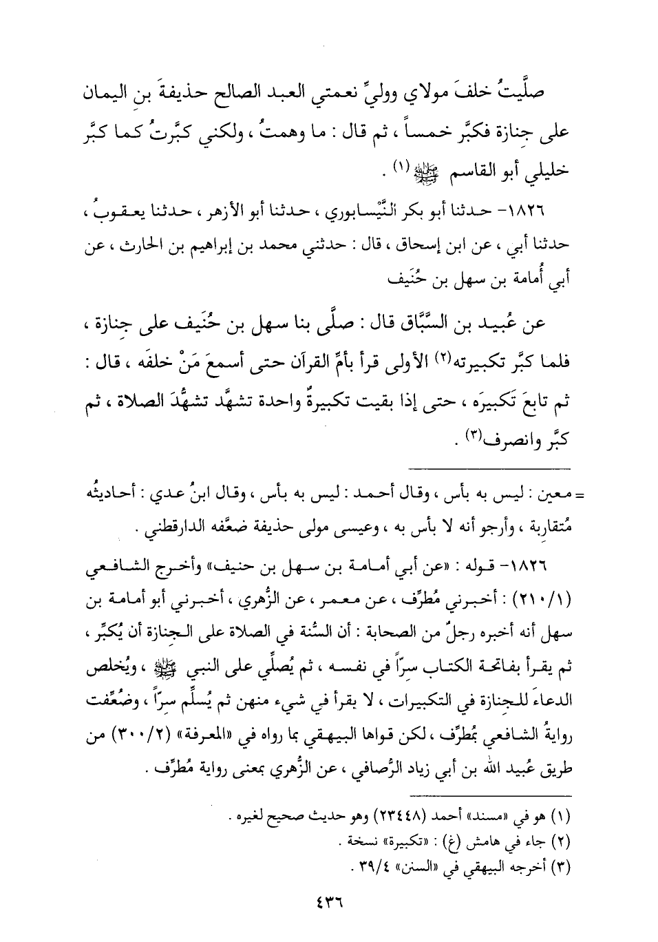 1826 - حَدَّثَنَا أَبُو بَكْرٍ النَّيْسَابُورِيُّ , حَدَّثَنَا أَبُو الْأَزْهَرِ , حَدَّثَنَا يَعْقُوبُ , حَدَّثَنَا أَبِي , عَنِ ابْنِ إِسْحَاقَ , حَدَّثَنِي مُحَمَّدُ بْنُ إِبْرَاهِيمَ بْنِ الْحَارِثِ , عَنْ أَبِي أُمَامَةَ بْنِ سَهْلِ بْنِ حُنَيْفٍ , عَنْ عُبَيْدِ بْنِ السَّبَّاقِ , قَالَ: صَلَّى بِنَا سَهْلُ بْنُ حُنَيْفٍ عَلَى جِنَازَةٍ فَلَمَّا كَبَّرَ التَّكْبِيرَةَ الْأُولَى قَرَأَ بِأُمِّ الْقُرْآنِ حَتَّى أَسْمَعَ مِنْ خَلْفِهِ , قَالَ: ثُمَّ تَابَعَ تَكْبِيرَهُ §حَتَّى إِذَا بَقِيَتْ تَكْبِيرَةٌ وَاحِدَةٌ تَشَهَّدَ تَشَهُّدَ الصَّلَاةِ ثُمَّ كَبَّرَ وَانْصَرَفَ "
