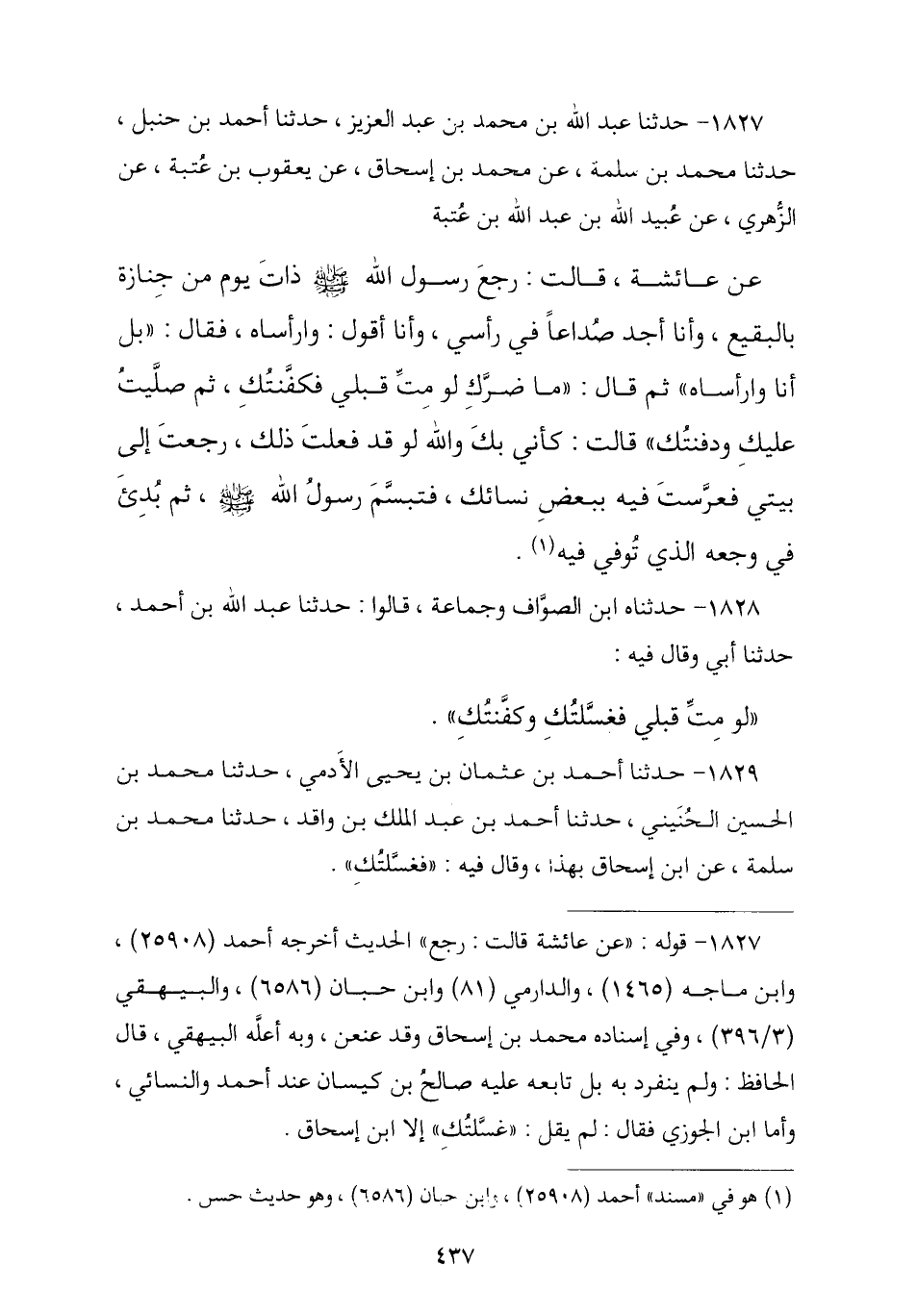 1827 - حَدَّثَنَا عَبْدُ اللَّهِ بْنُ مُحَمَّدِ بْنِ عَبْدِ الْعَزِيزِ , حَدَّثَنَا أَحْمَدُ بْنُ حَنْبَلٍ , حَدَّثَنَا مُحَمَّدُ بْنُ سَلَمَةَ , عَنْ مُحَمَّدِ بْنِ إِسْحَاقَ , عَنْ يَعْقُوبَ بْنِ عُتْبَةَ , عَنِ الزُّهْرِيِّ , عَنْ عُبَيْدِ اللَّهِ بْنِ عَبْدِ اللَّهِ بْنِ عُتْبَةَ , عَنْ عَائِشَةَ , قَالَتْ: رَجَعَ رَسُولُ اللَّهِ صَلَّى اللهُ عَلَيْهِ وَسَلَّمَ ذَاتَ يَوْمٍ مِنْ جِنَازَةٍ بِالْبَقِيعِ وَأَنَا أَجِدُ صُدَاعًا فِي رَأْسِي وَأَنَا أَقُولُ: وَارَأْسَاهْ , فَقَالَ: «§بَلْ أَنَا وَارَأْسَاهُ» , ثُمَّ قَالَ: «مَا ضَرَّكِ لَوْ مُتِّ قَبْلِي فَكَفَّنْتُكِ ثُمَّ صَلَّيْتُ عَلَيْكِ وَدَفَنْتُكِ» , قَالَتْ: كَأَنِّي بِكَ وَاللَّهِ لَوْ قَدْ فَعَلْتَ ذَلِكَ , رَجَعْتَ إِلَى بَيْتِي فَعَرَّسْتَ فِيهِ بِبَعْضِ نِسَائِكَ , فَتَبَسَّمَ رَسُولُ اللَّهِ صَلَّى اللهُ عَلَيْهِ وَسَلَّمَ ثُمَّ بَدَى فِي وَجَعِهِ الَّذِي تُوُفِّيَ فِيهِ.