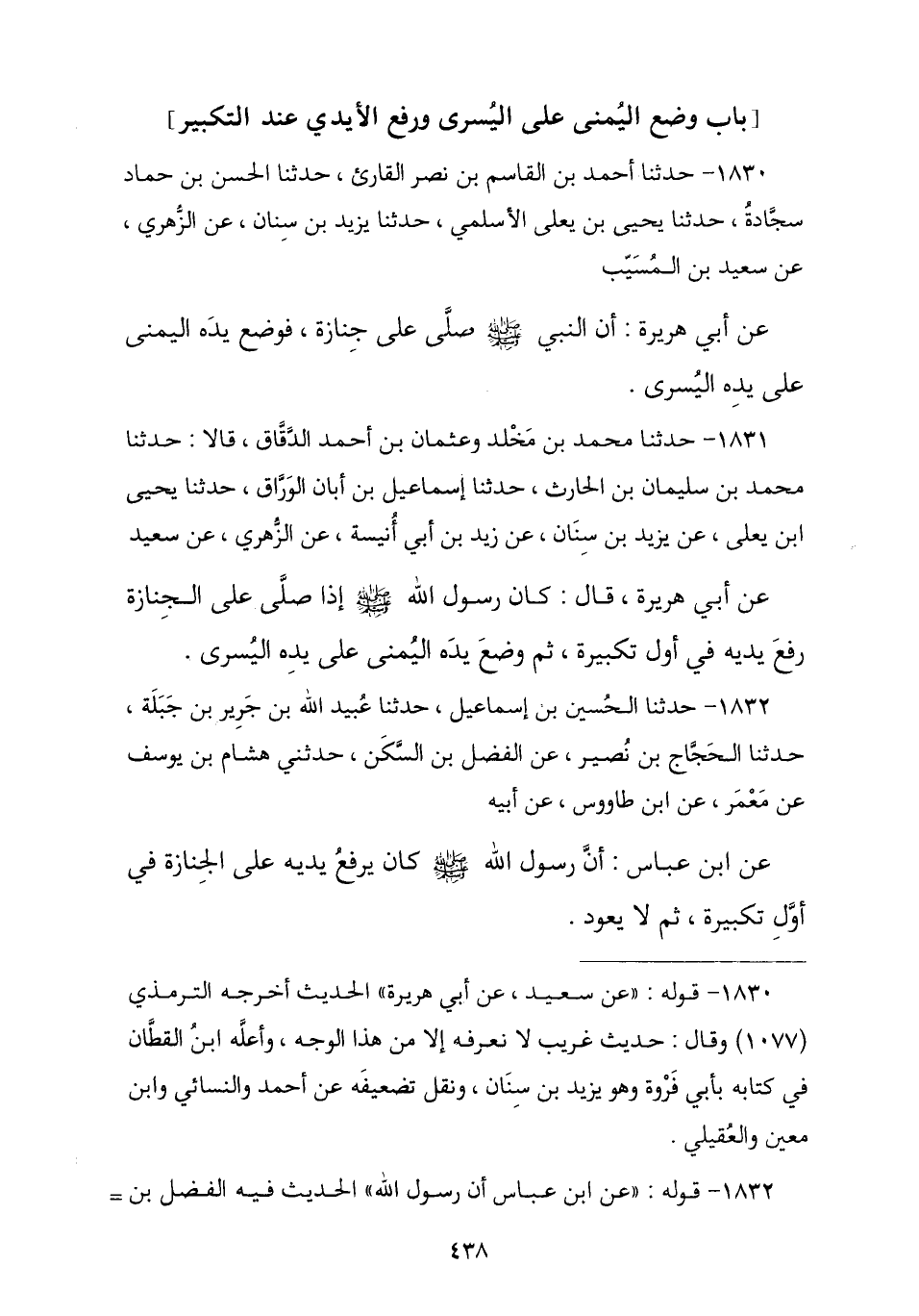 1830 - ثنا أَحْمَدُ بْنُ الْقَاسِمِ بْنِ نَصْرٍ الْقَارِئُ , ثنا الْحَسَنُ بْنُ حَمَّادٍ سَجَّادَةُ , ثنا يَحْيَى بْنُ يَعْلَى الْأَسْلَمِيُّ , ثنا يَزِيدُ بْنُ سِنَانٍ , عَنِ الزُّهْرِيِّ , عَنْ سَعِيدِ بْنِ الْمُسَيِّبِ , عَنْ أَبِي هُرَيْرَةَ , أَنَّ النَّبِيَّ صَلَّى اللهُ عَلَيْهِ وَسَلَّمَ § «صَلَّى عَلَى جِنَازَةٍ فَوَضَعَ يَدَهُ الْيُمْنَى عَلَى يَدِهِ الْيُسْرَى»