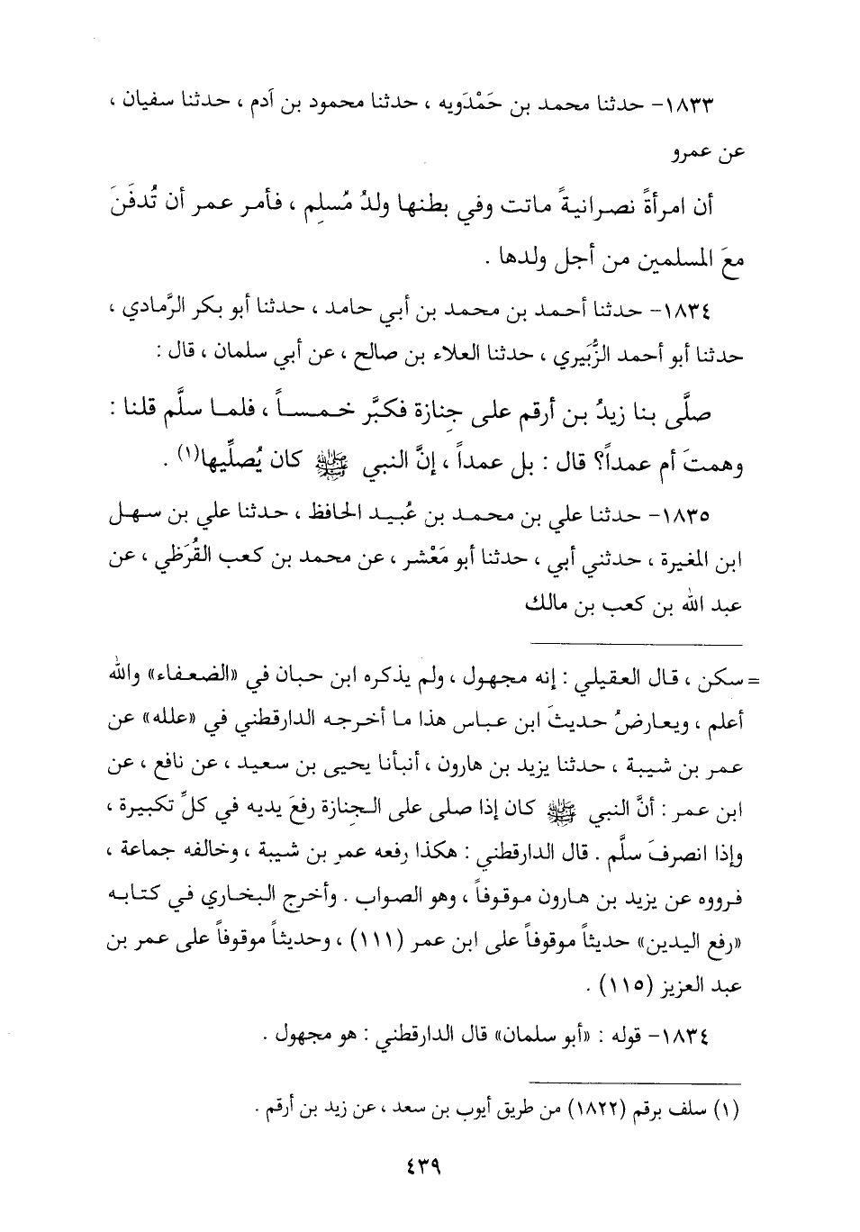 1834 - حَدَّثَنَا أَحْمَدُ بْنُ مُحَمَّدِ بْنِ أَبِي حَامِدٍ , ثنا أَبُو بَكْرٍ الرَّمَادِيُّ , ثنا أَبُو أَحْمَدَ الزُّبَيْرِيُّ , ثنا الْعَلَاءُ بْنُ صَالِحٍ , عَنْ أَبِي سَلْمَانَ , قَالَ: صَلَّى زَيْدُ بْنُ أَرْقَمَ عَلَى جِنَازَةٍ " §فَكَبَّرَ خَمْسًا فَلَمَّا سَلَّمَ قُلْنَا لَهُ: وَهِمْتَ أَمْ عَمْدًا؟ , قَالَ: بَلْ عَمْدًا , إِنَّ النَّبِيَّ صَلَّى اللهُ عَلَيْهِ وَسَلَّمَ كَانَ يُصَلِّيهَا "