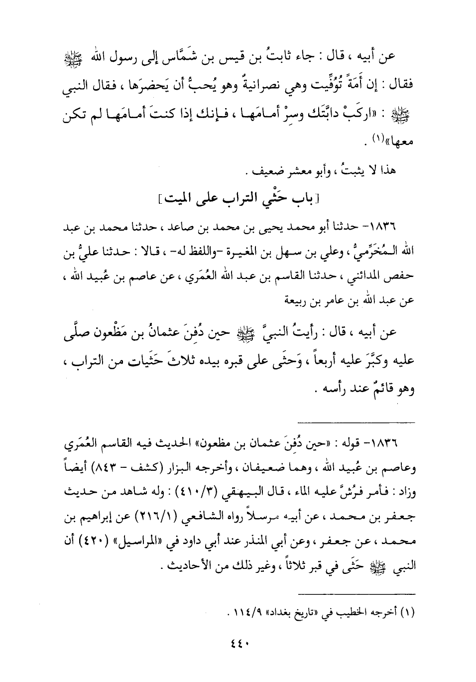 1836 - حَدَّثَنَا أَبُو مُحَمَّدِ بْنُ صَاعِدٍ , ثنا مُحَمَّدُ بْنُ عَبْدِ اللَّهِ الْمُخَرِّمِيُّ , وَعَلِيُّ بْنُ سَهْلِ بْنِ الْمُغِيرَةِ وَاللَّفْظُ لَهُ , قَالَا: نا عَلِيُّ بْنُ حَفْصٍ الْمَدَائِنِيُّ , ثنا الْقَاسِمُ بْنُ عَبْدِ اللَّهِ الْعُمَرِيُّ , عَنْ عَاصِمِ بْنِ عُبَيْدِ اللَّهِ , عَنْ عَبْدِ اللَّهِ بْنِ عَامِرِ بْنِ رَبِيعَةَ , عَنْ أَبِيهِ , قَالَ: رَأَيْتُ النَّبِيَّ صَلَّى اللهُ عَلَيْهِ وَسَلَّمَ حِينَ دُفِنَ عُثْمَانُ بْنُ مَظْعُونٍ §صَلَّى عَلَيْهِ وَكَبَّرَ عَلَيْهِ أَرْبَعًا , وَحَثَى عَلَى قَبْرِهِ بِيَدِهِ ثَلَاثَ حَثَيَاتٍ مِنَ التُّرَابِ وَهُوَ قَائِمٌ عِنْدَ رَأْسِهِ "
