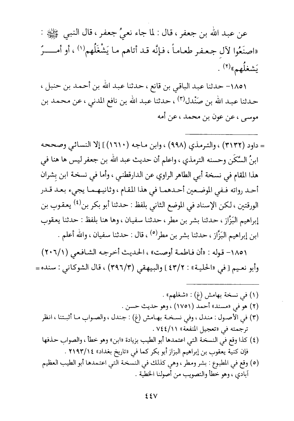 1851 - حَدَّثَنَا عَبْدُ الْبَاقِي بْنُ قَانِعٍ , نا عَبْدُ اللَّهِ بْنُ أَحْمَدَ بْنِ حَنْبَلٍ , نا عَبْدُ اللَّهِ بْنُ صَنْدَلٍ , نا عَبْدُ اللَّهِ بْنُ نَافِعٍ الْمَدَنِيُّ , عَنْ مُحَمَّدِ بْنِ مُوسَى , عَنْ عَوْنِ بْنِ مُحَمَّدٍ , عَنْ أُمِّهِ , -[448]- عَنْ أَسْمَاءَ بِنْتِ عُمَيْسٍ , أَنَّ فَاطِمَةَ «§أَوْصَتْ أَنْ يُغَسِّلَهَا زَوْجُهَا عَلِيٌّ وَأَسْمَاءُ فَغَسَّلَاهَا»