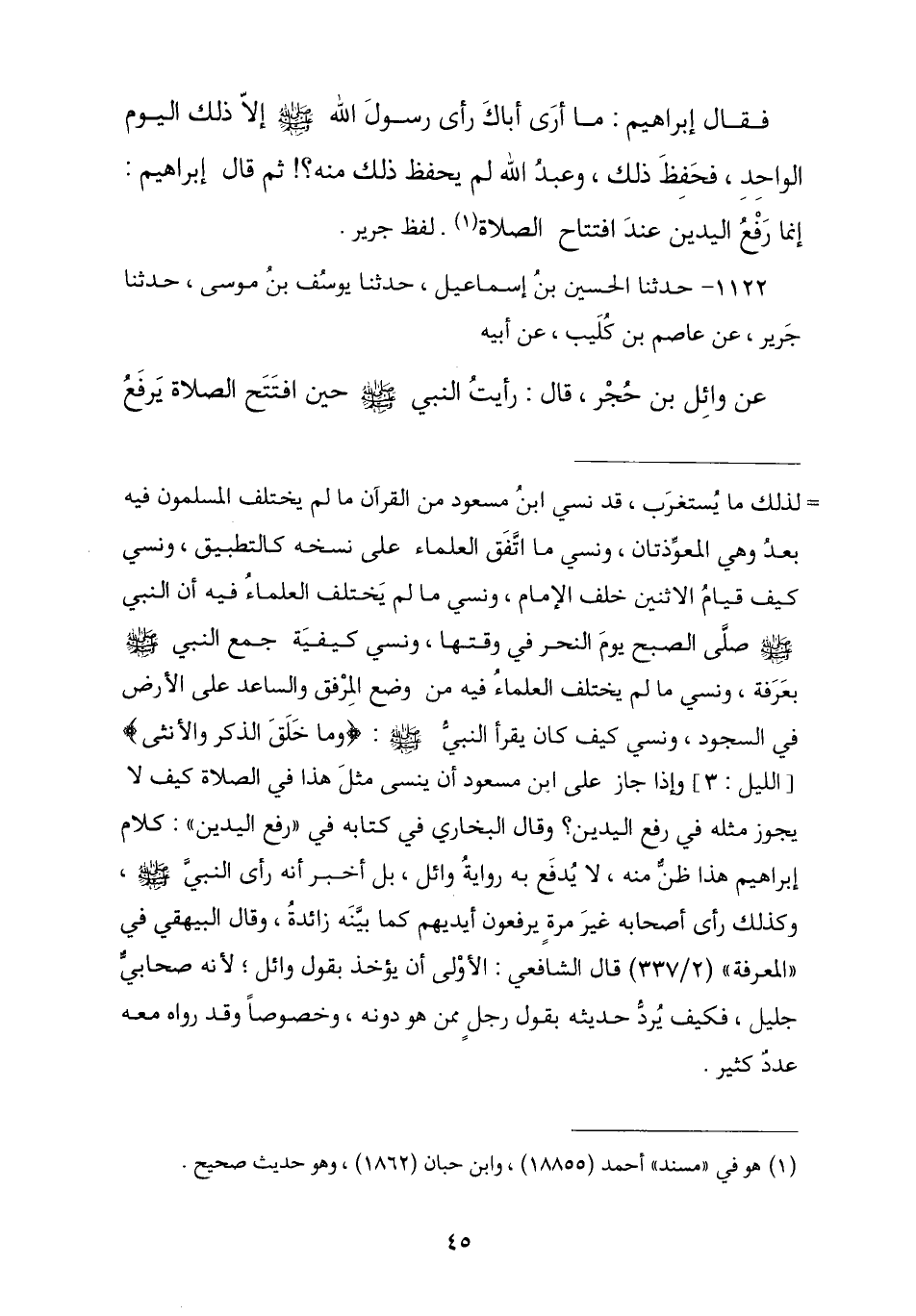 1122 - حَدَّثَنَا الْحُسَيْنُ بْنُ إِسْمَاعِيلَ , نا يُوسُفُ بْنُ مُوسَى , ثنا جَرِيرٌ , عَنْ عَاصِمِ بْنِ كُلَيْبٍ , عَنْ أَبِيهِ , عَنْ وَائِلِ بْنِ حَجَرٍ , قَالَ: رَأَيْتُ النَّبِيَّ صَلَّى اللهُ عَلَيْهِ وَسَلَّمَ §حِينَ افْتَتَحَ الصَّلَاةَ يَرْفَعُ -[46]- يَدَيْهِ إِلَى أُذُنَيْهِ , وَإِذَا رَكَعَ , وَإِذَا قَالَ: «سَمِعَ اللَّهُ لِمَنْ حَمِدَهُ» رَفَعَ يَدَيْهِ