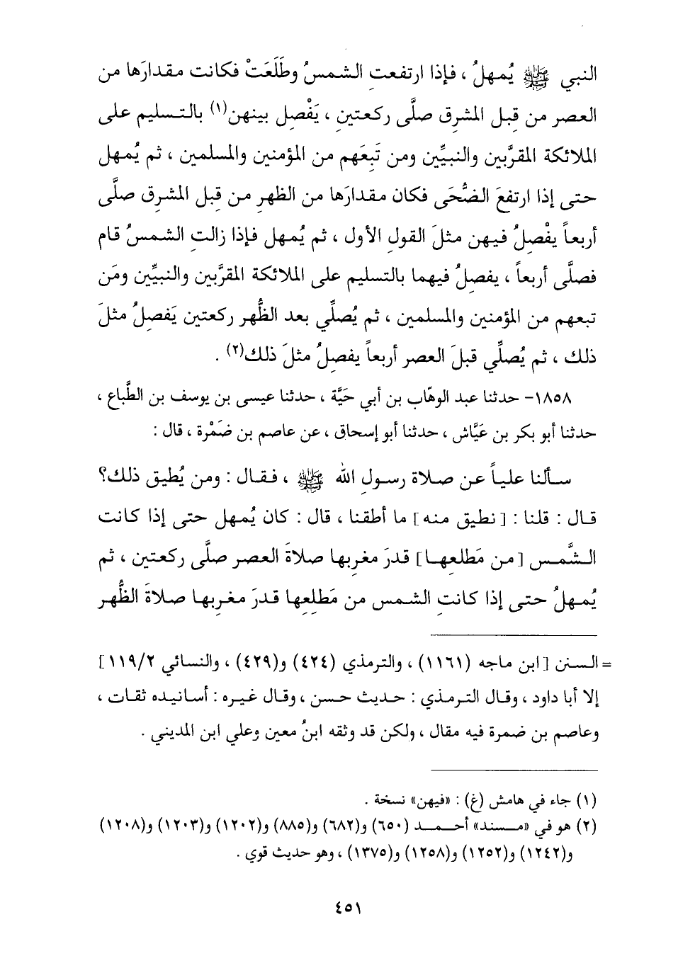 1858 - حَدَّثَنَا عَبْدُ الْوَهَّابِ بْنُ أَبِي حَيَّةَ , ثنا عِيسَى بْنُ يُوسُفَ بْنِ الطَّبَّاعِ , ثنا أَبُو بَكْرِ بْنُ عَيَّاشٍ , ثنا أَبُو إِسْحَاقَ , عَنْ عَاصِمِ بْنِ ضَمْرَةَ , قَالَ: سَأَلْنَا عَلِيًّا رَضِيَ اللَّهُ عَنْهُ عَنْ صَلَاةِ رَسُولِ اللَّهِ صَلَّى اللهُ عَلَيْهِ وَسَلَّمَ فَقَالَ: وَمَنْ يُطِيقُ ذَلِكَ؟ , قُلْنَا: مَا أَطَقْنَا , قَالَ: «كَانَ يُمْهِلُ حَتَّى إِذَا كَانَتِ الشَّمْسُ مِنْ مَطْلِعِهَا قَدْرَ مَغْرِبِهَا صَلَاةَ الْعَصْرِ §صَلَّى رَكْعَتَيْنِ , ثُمَّ يُمْهِلُ حَتَّى إِذَا كَانَتِ الشَّمْسُ مِنْ مَطْلِعِهَا قَدْرَ مَغْرِبِهَا صَلَاةَ الظُّهْرِ -[452]- صَلَّى أَرْبَعَ رَكَعَاتٍ , ثُمَّ يُصَلِّي بَعْدَ الزَّوَالِ أَرْبَعًا وَبَعْدَ الظُّهْرِ رَكْعَتَيْنِ وَقَبْلَ الْعَصْرِ أَرْبَعًا»