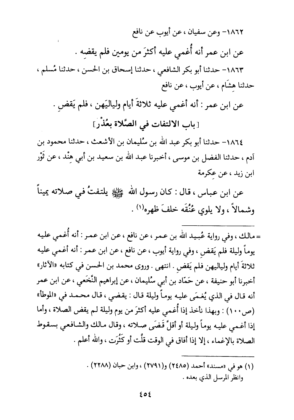 1863 - حَدَّثَنَا أَبُو بَكْرٍ الشَّافِعِيُّ , ثنا إِسْحَاقُ بْنُ الْحَسَنِ , ثنا مُسْلِمٌ , ثنا هِشَامٌ , عَنْ أَيُّوبَ , عَنْ نَافِعٍ , أَنَّ ابْنَ عُمَرَ § «أُغْمِيَ عَلَيْهِ ثَلَاثَةَ أَيَّامٍ وَلَيَالِيهِنَّ فَلَمْ يَقْضِ»